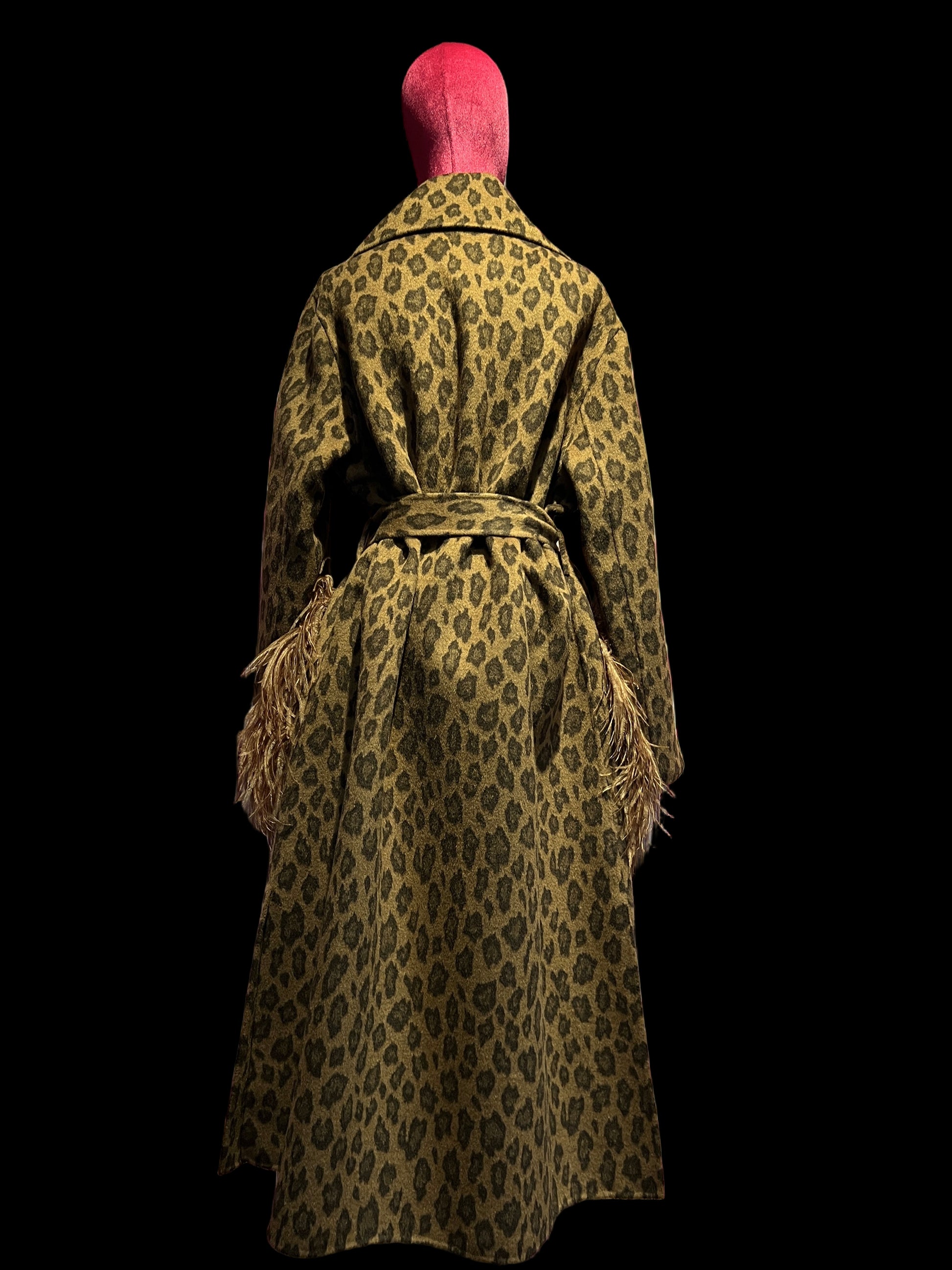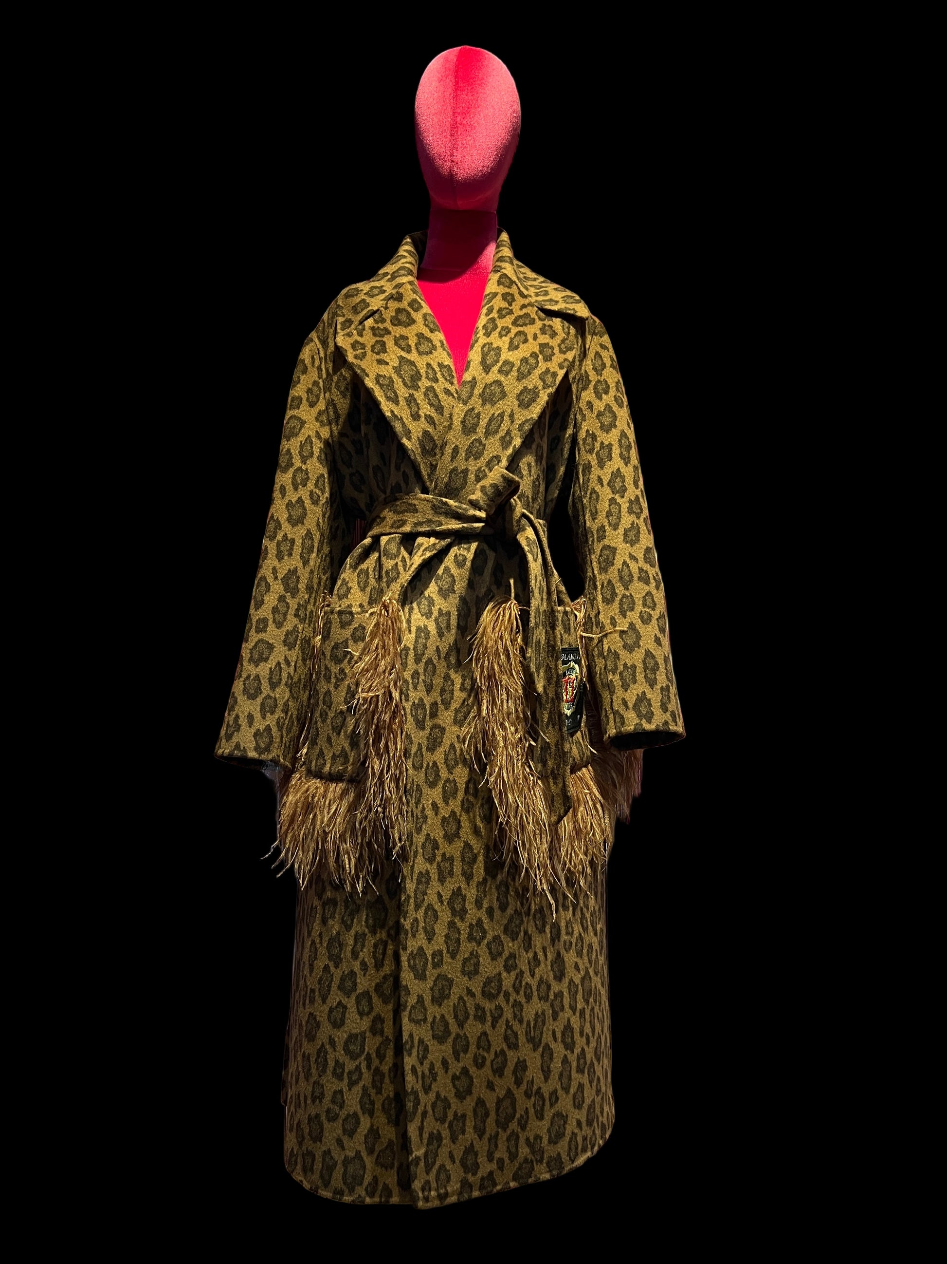 11 love is glamour cappotto fantasia leopardo marrone tasche patch e piume