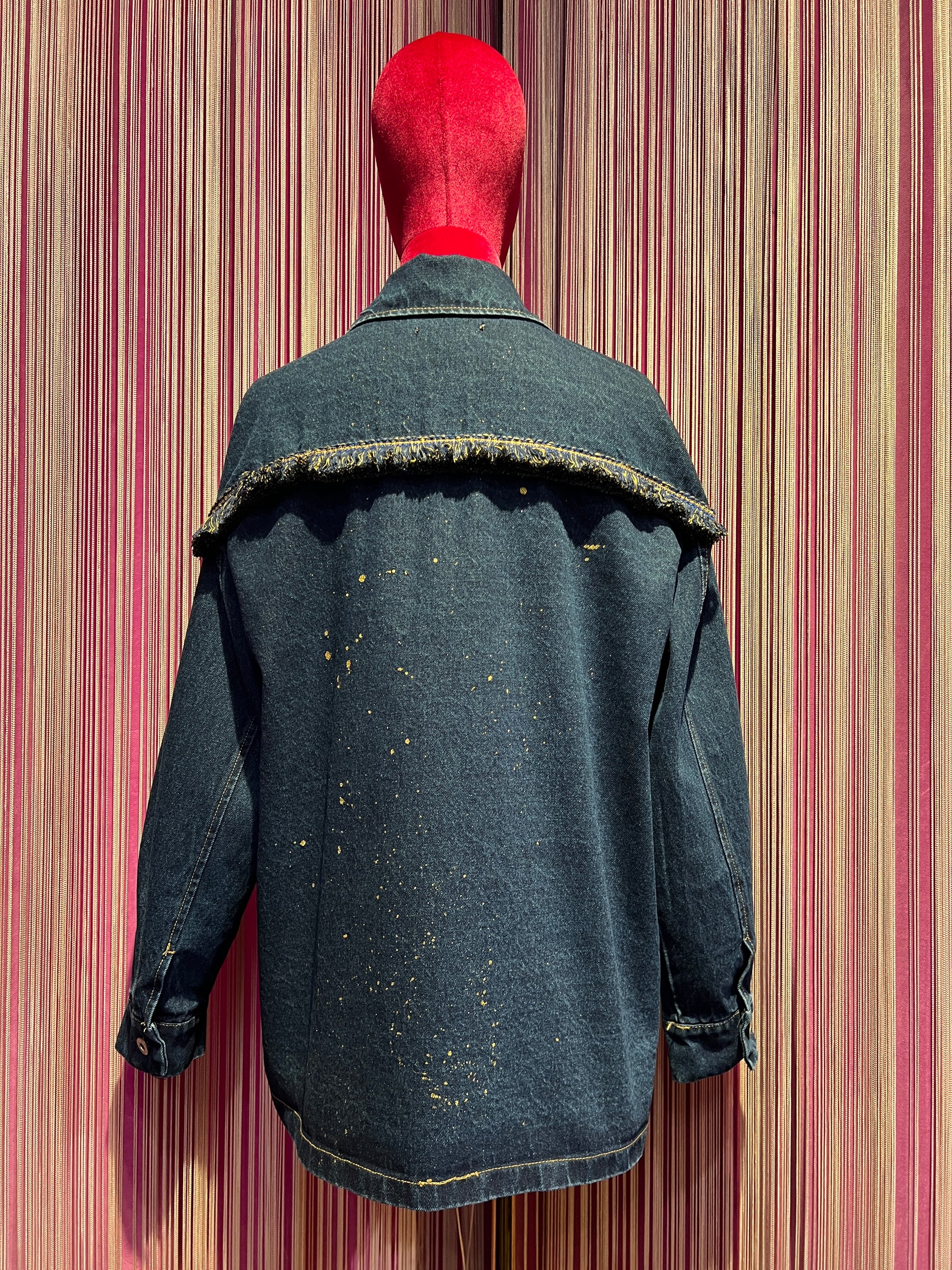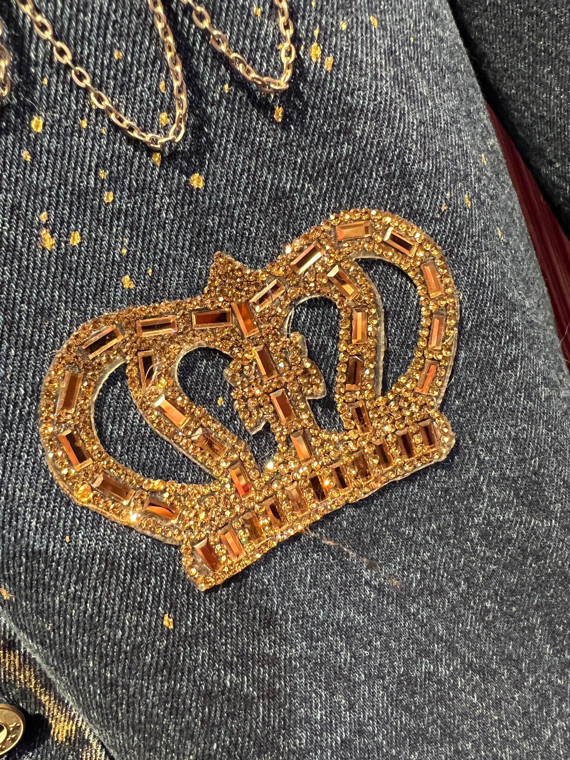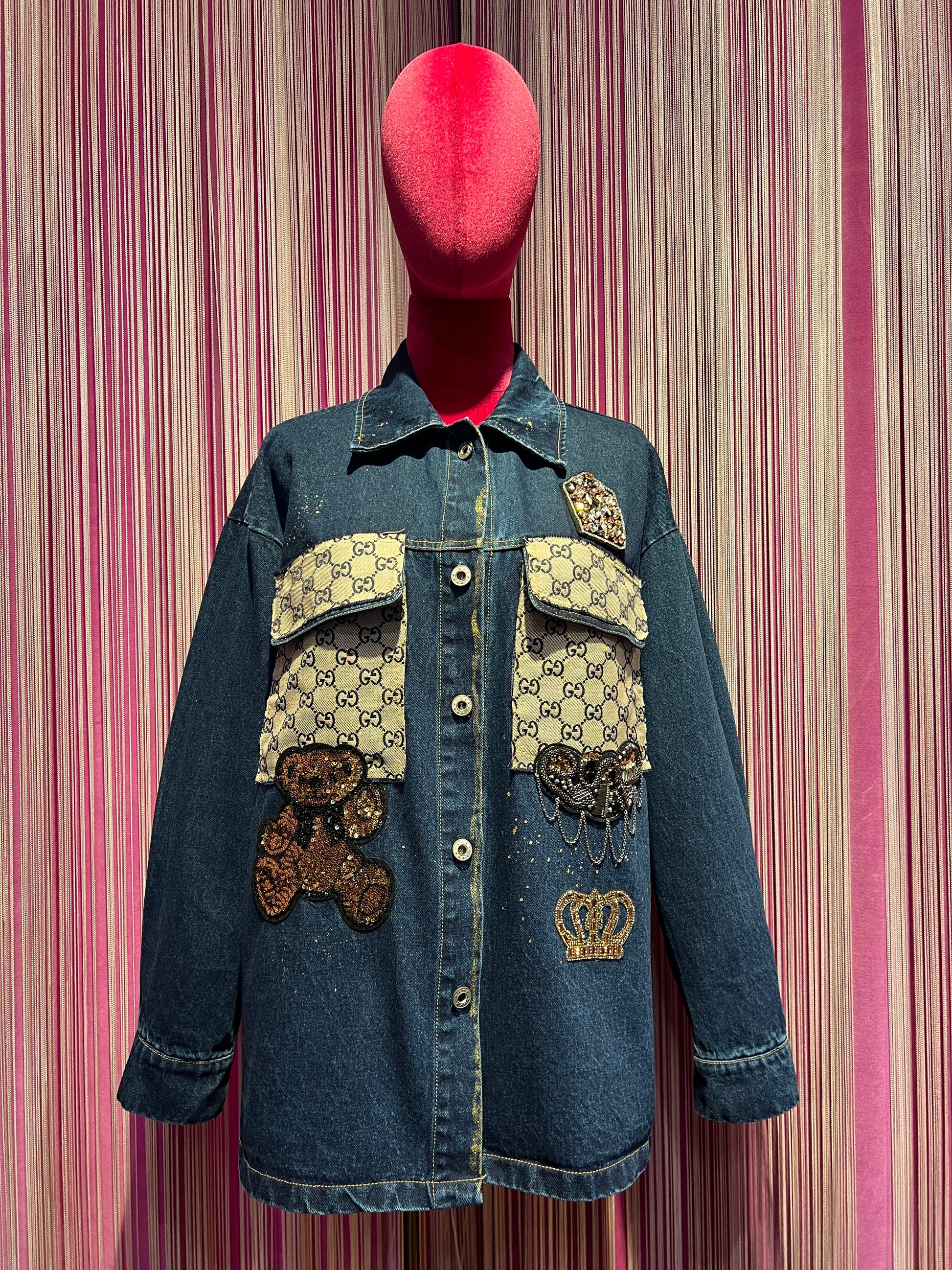 ABpink🩷 giacca camicia jeans con stoffa vintage patch orsetto paillettes oro