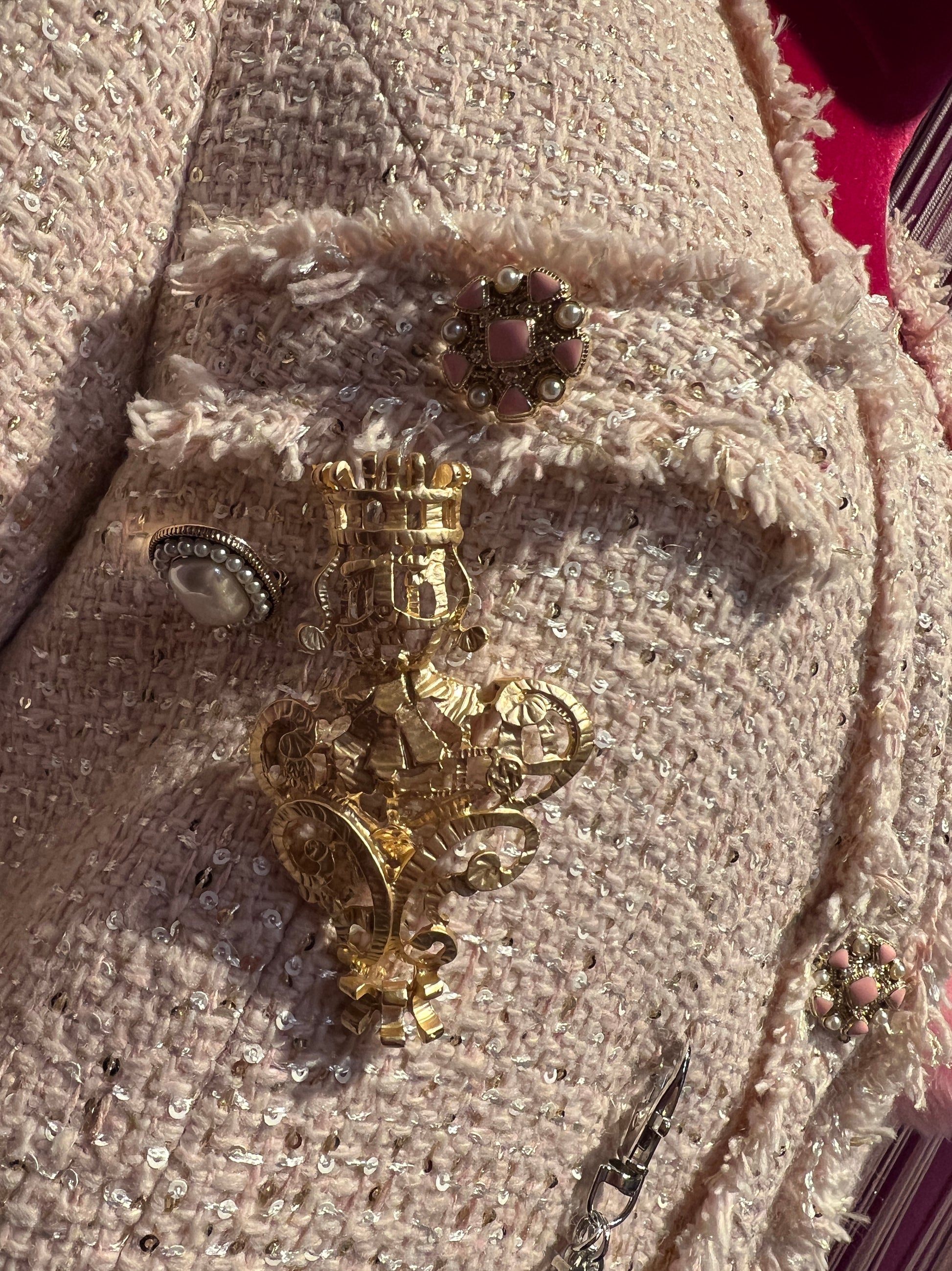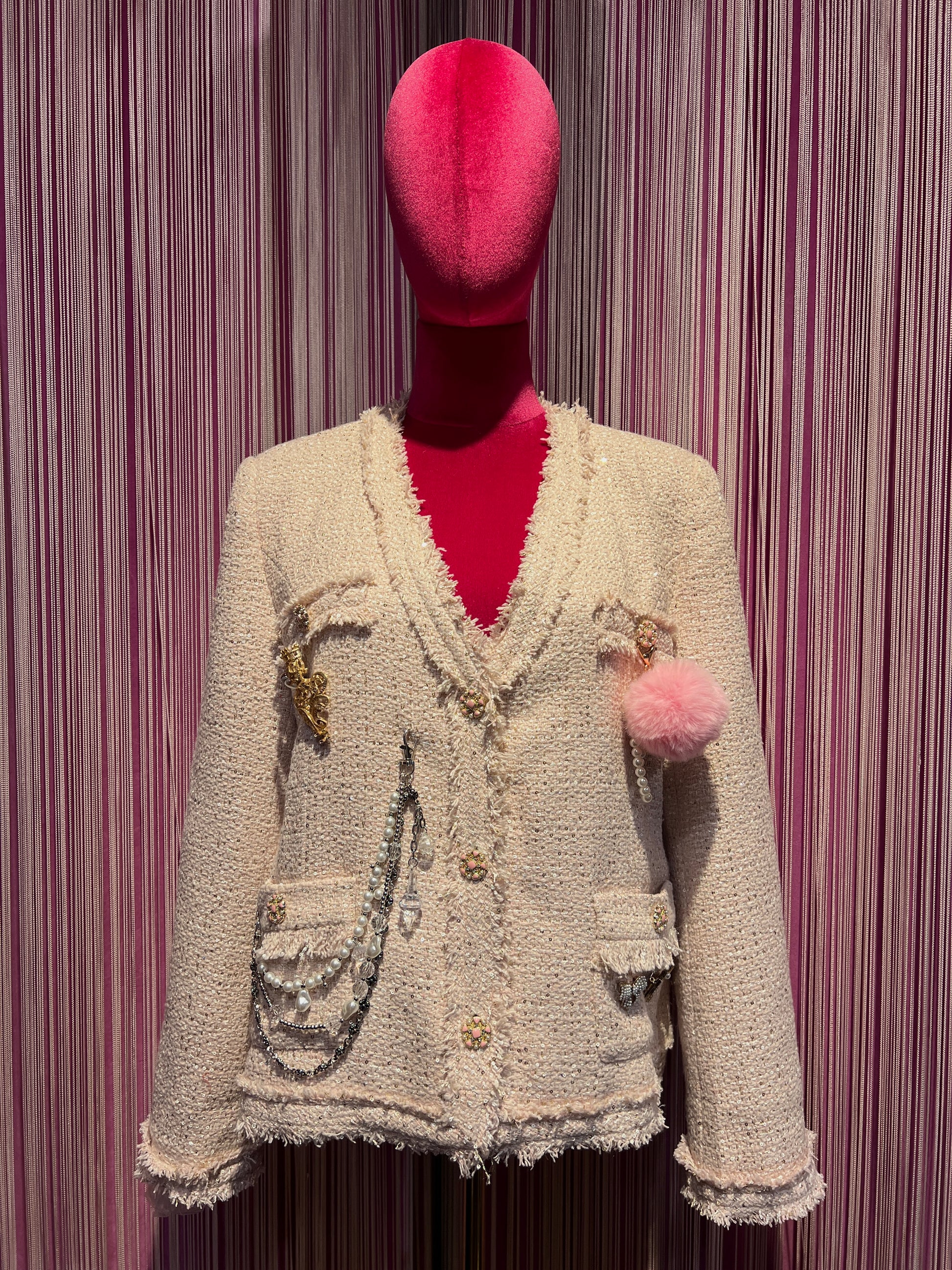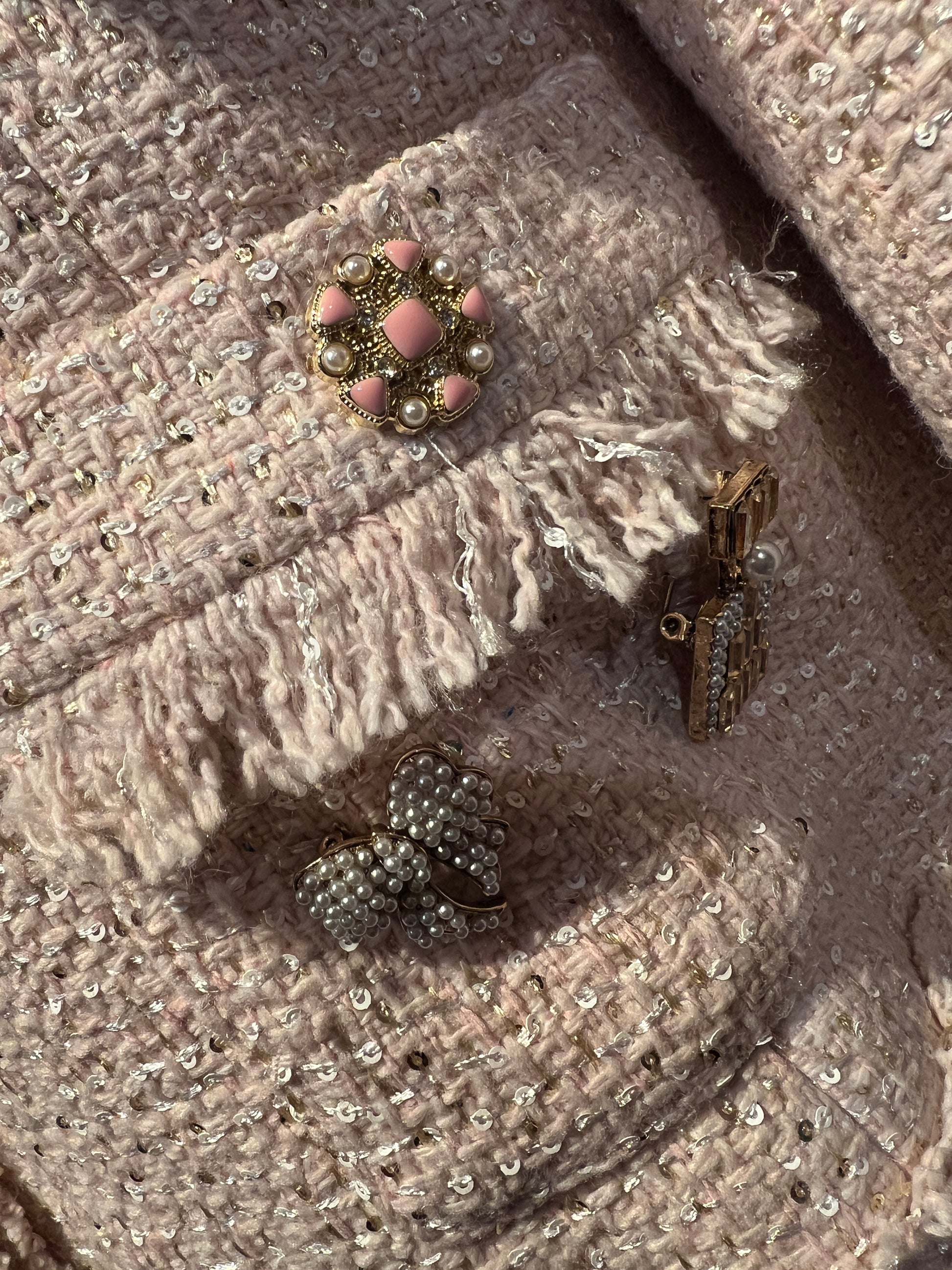 ABpink🩷 giacca in tweed boucle’ rosa con applicazioni spille e pon pon rosa