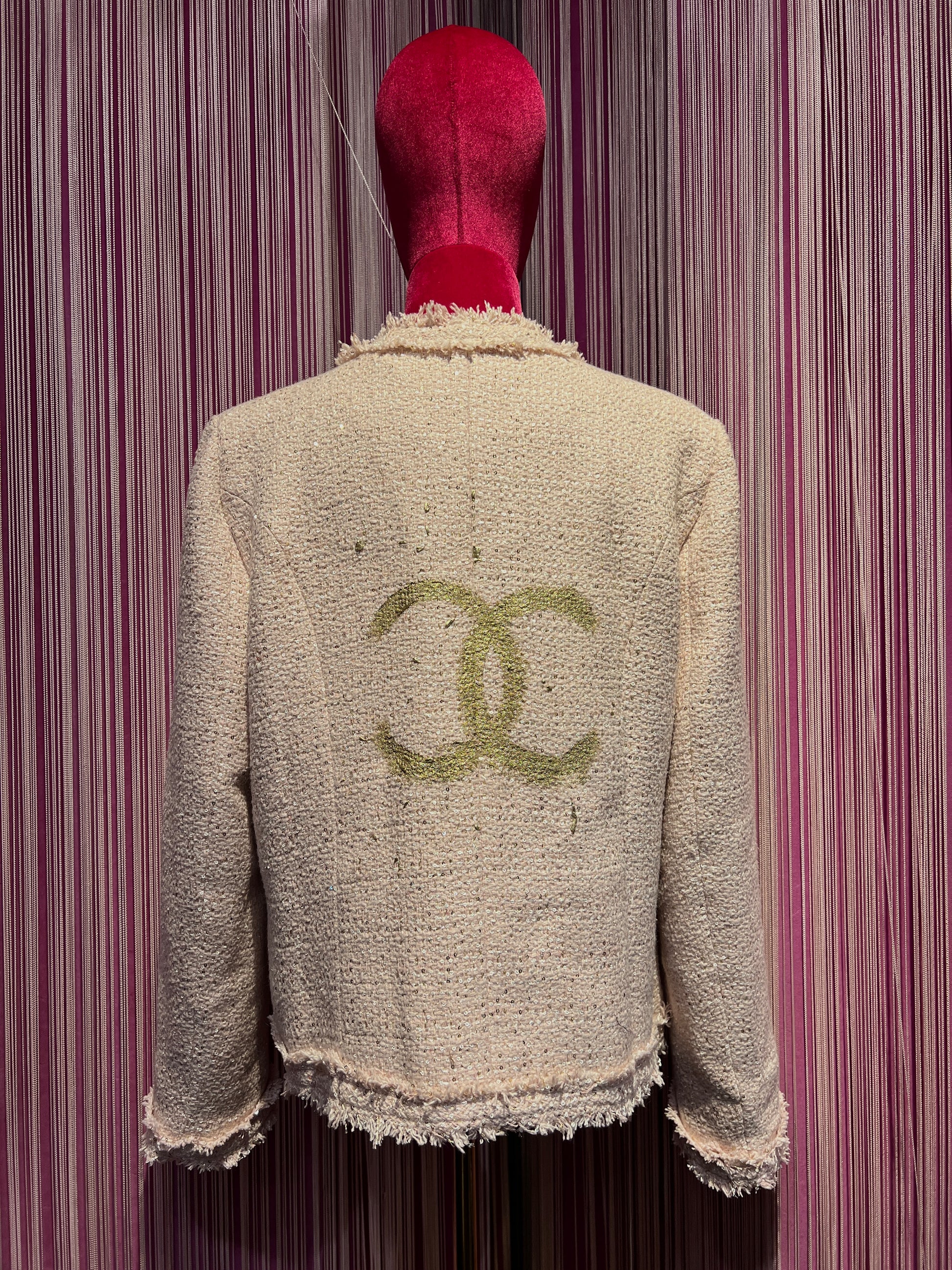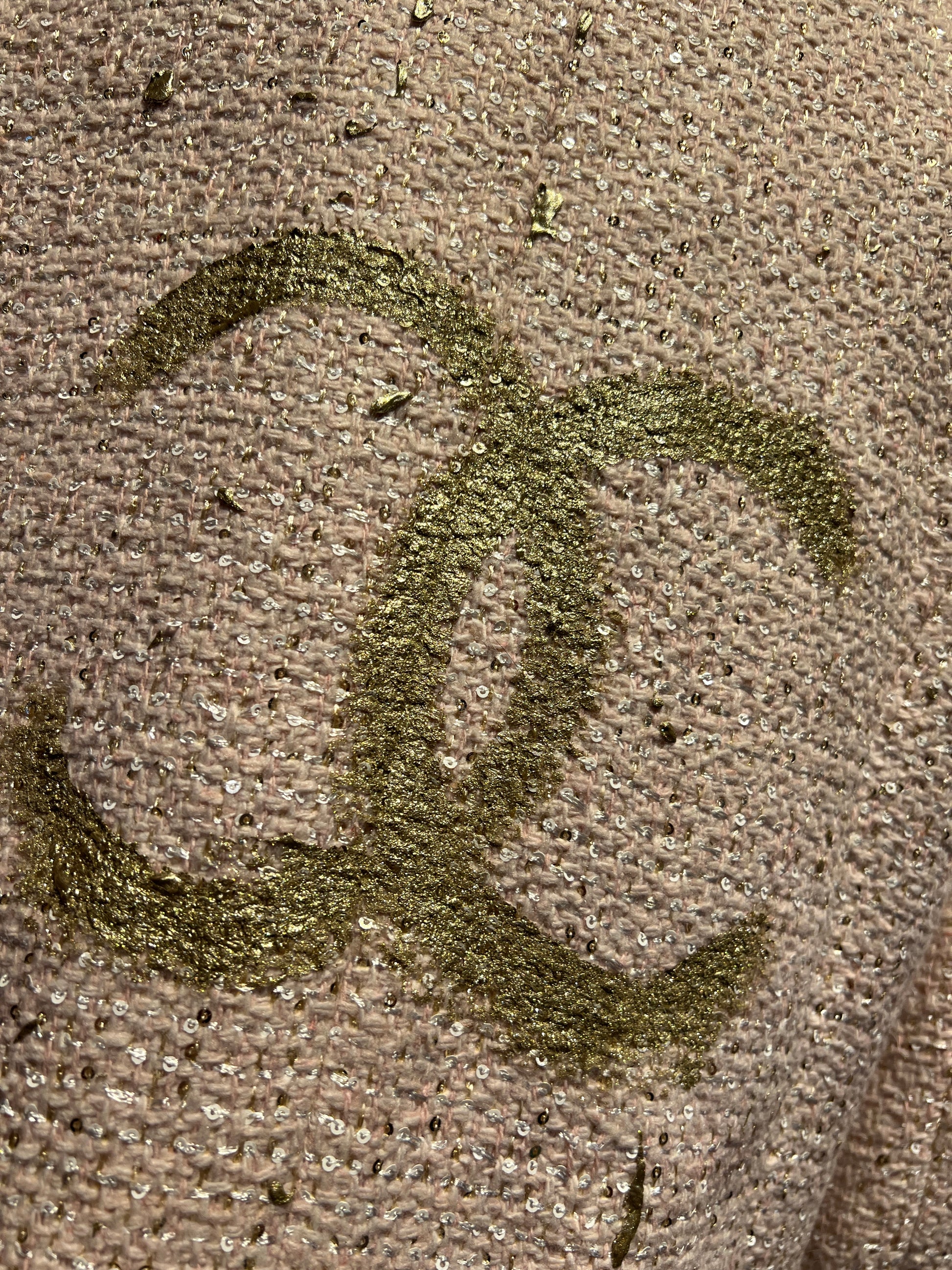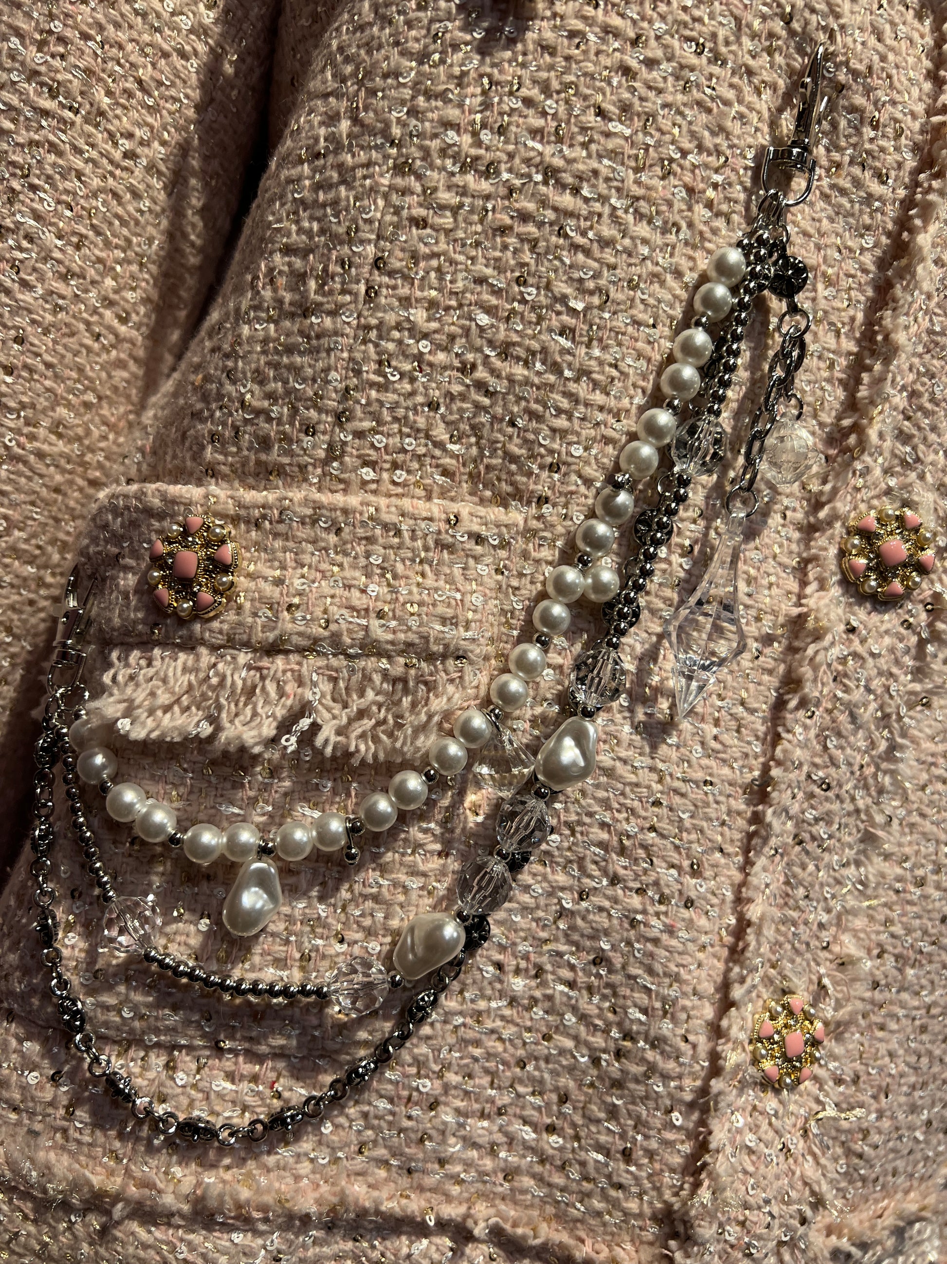 ABpink🩷 giacca in tweed boucle’ rosa con applicazioni spille e pon pon rosa