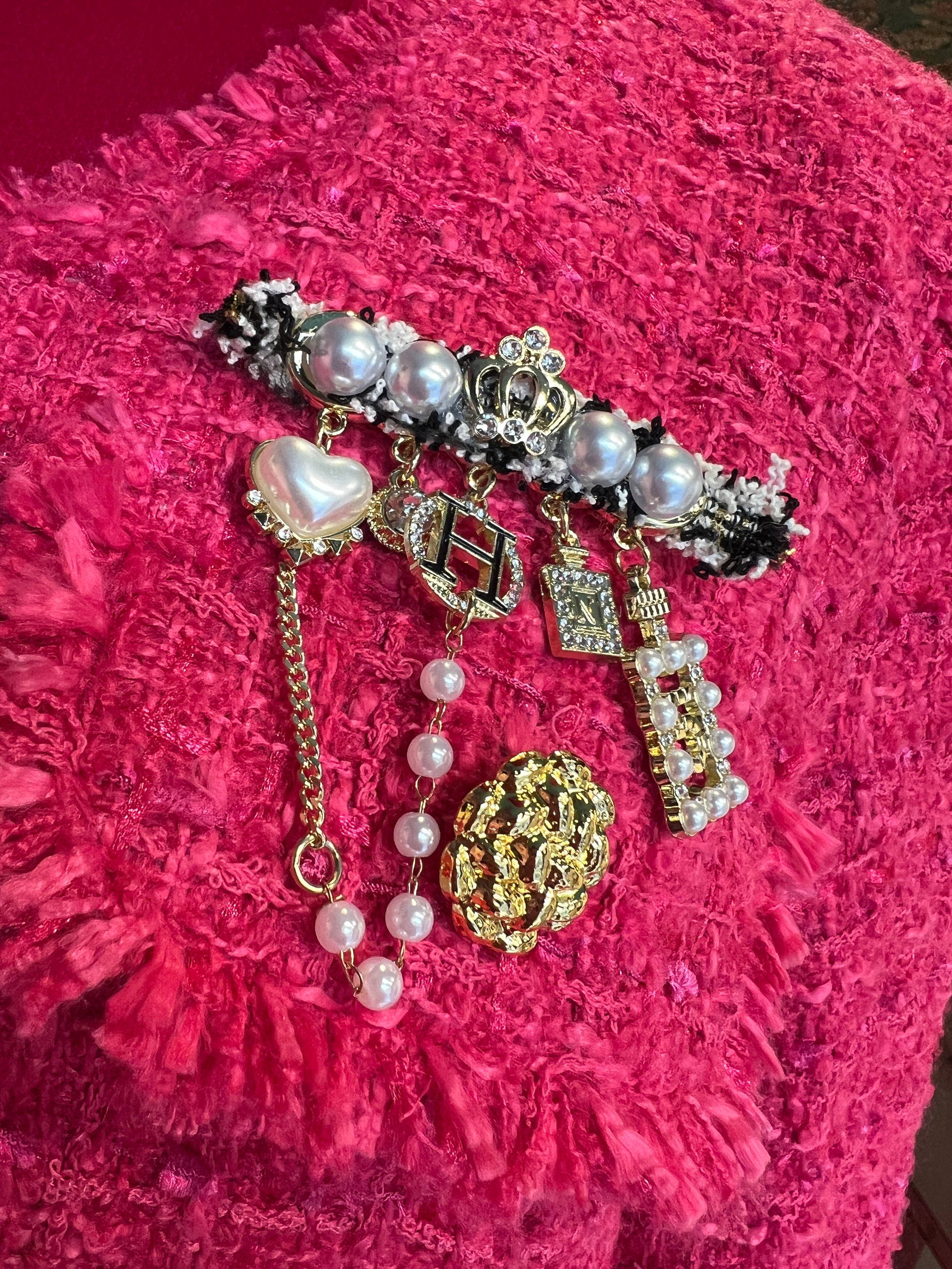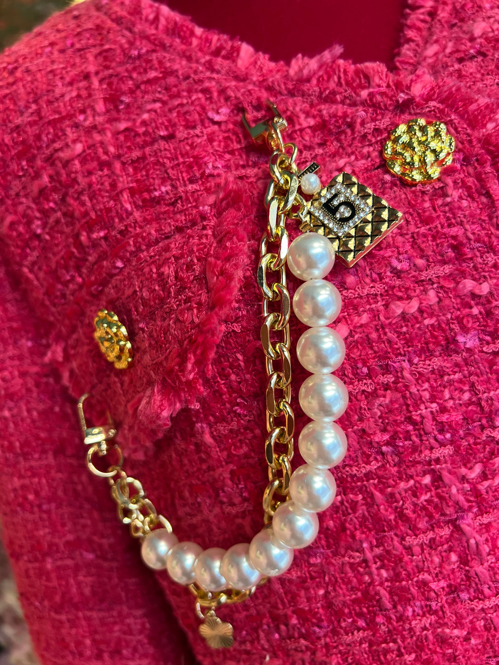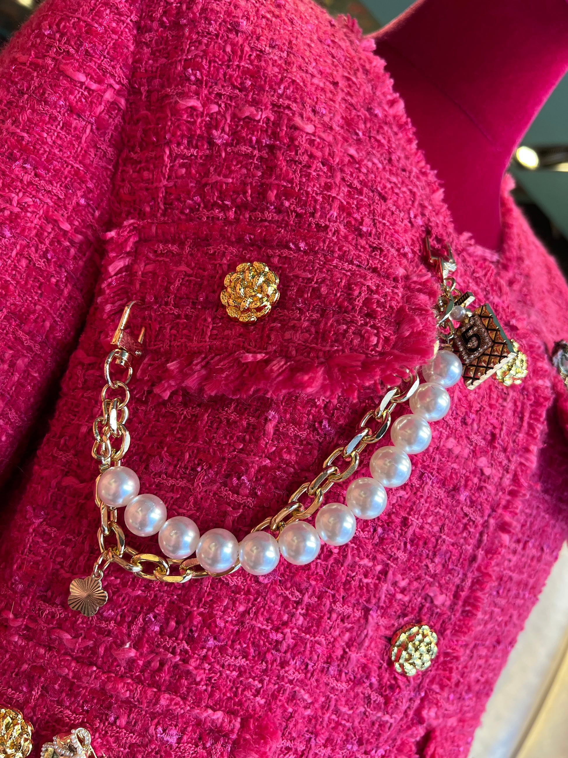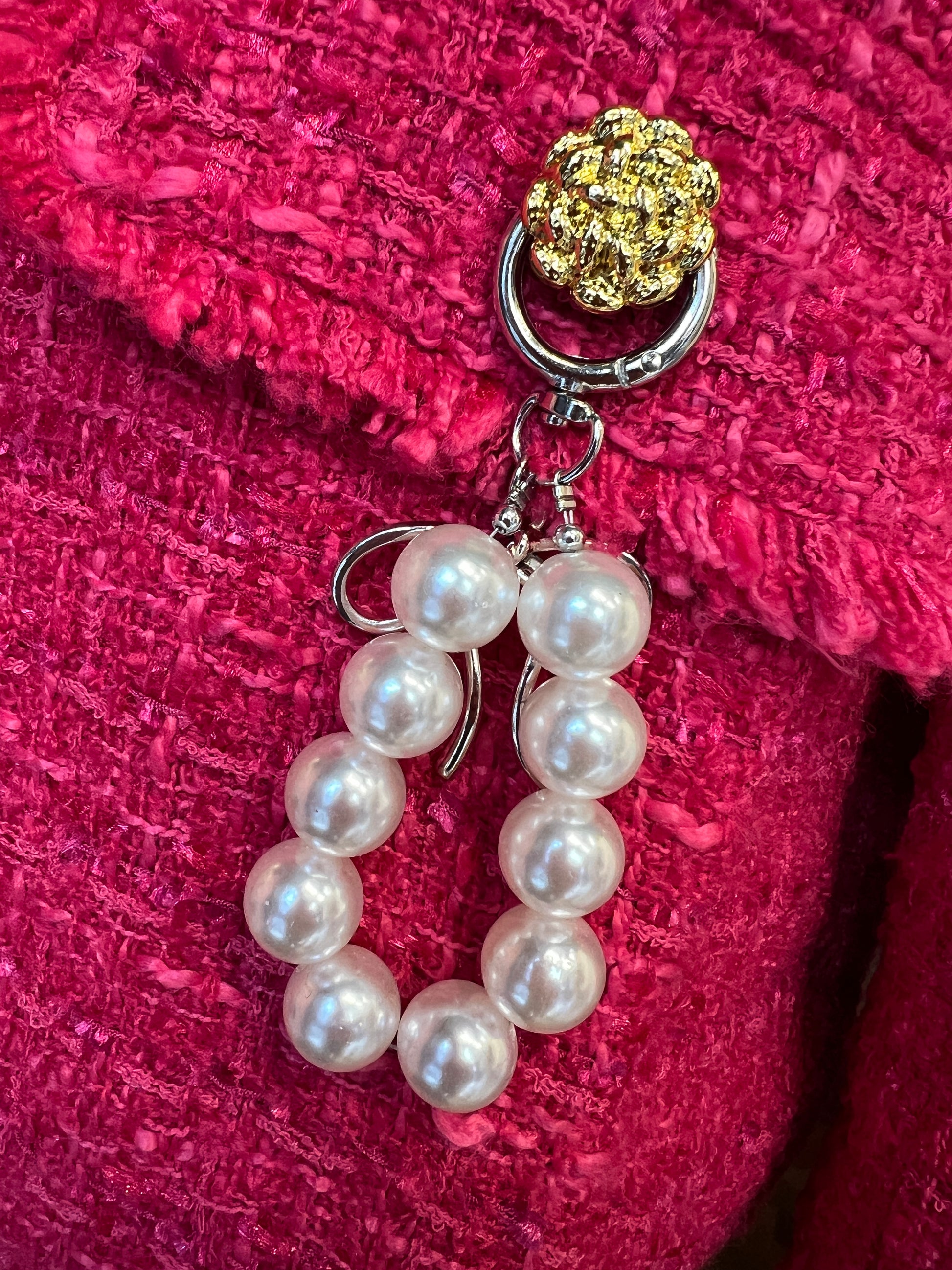 ABpink🩷 giacca in tweed boucle’ rosa fucsia con applicazioni perle e spille