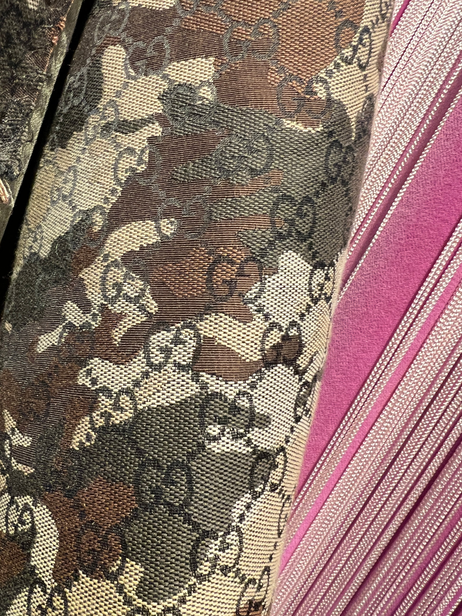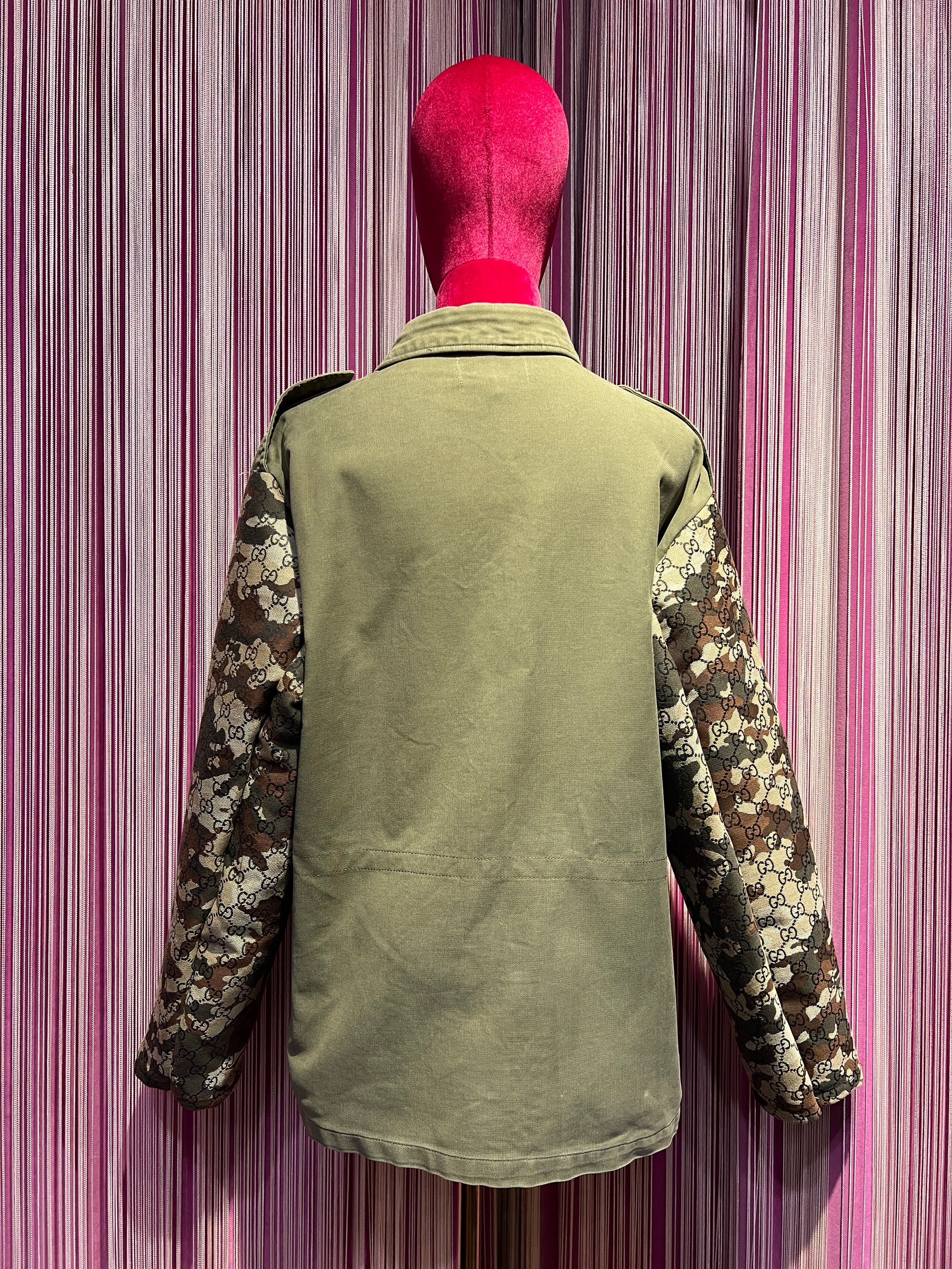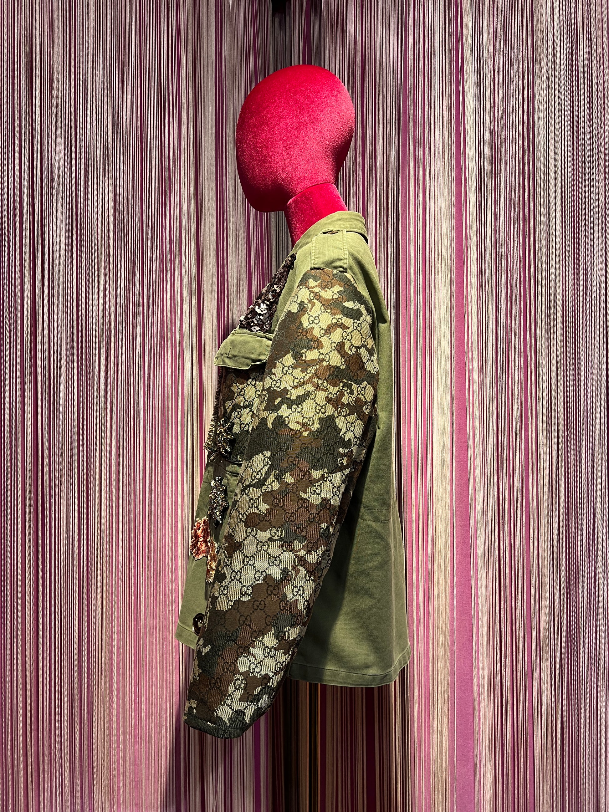 ABpink 🩷la verdina , giacca miltare con maniche camouflage logate e applicazioni patch paillettes, fiori ricamati e corona animalier