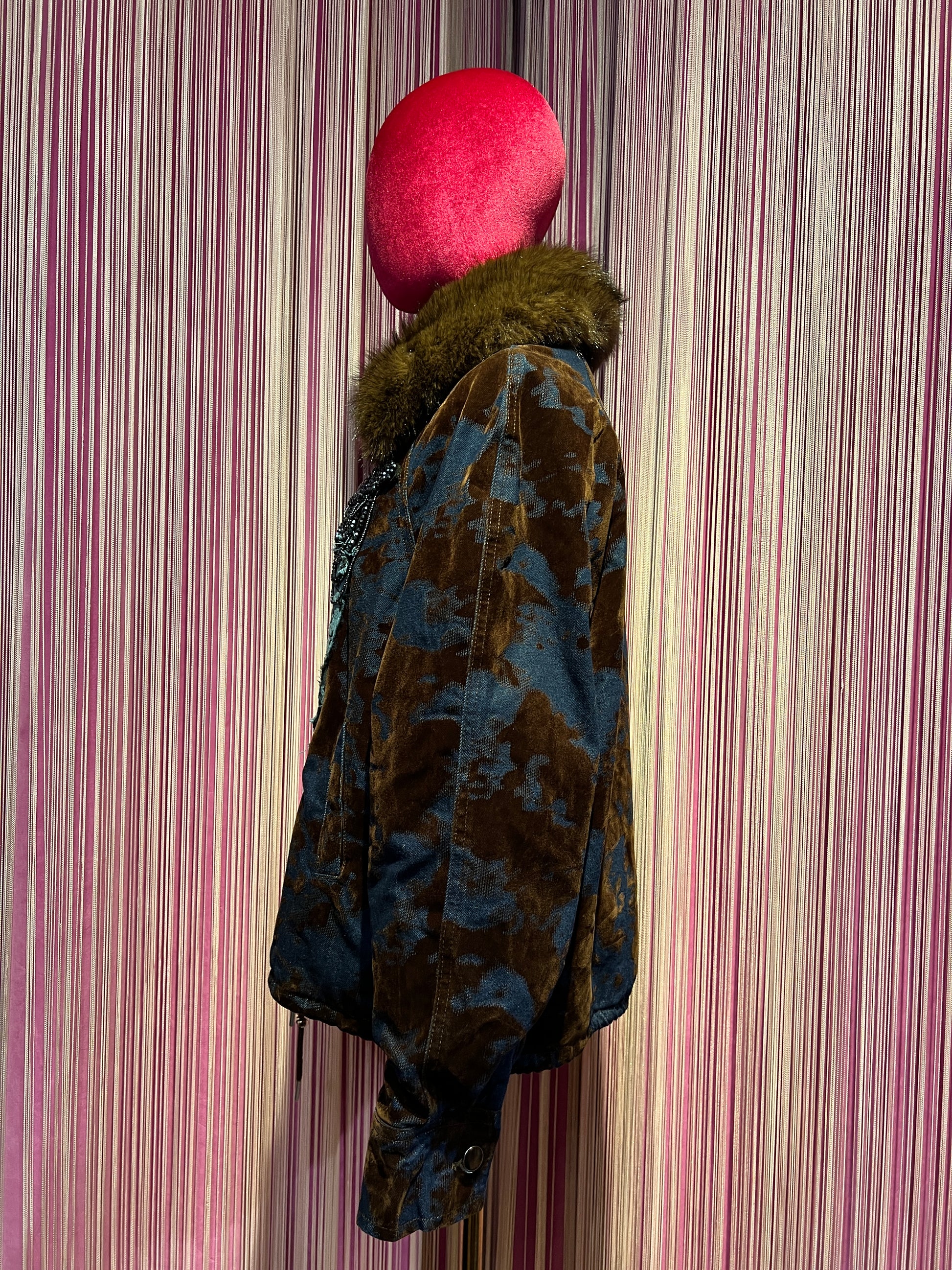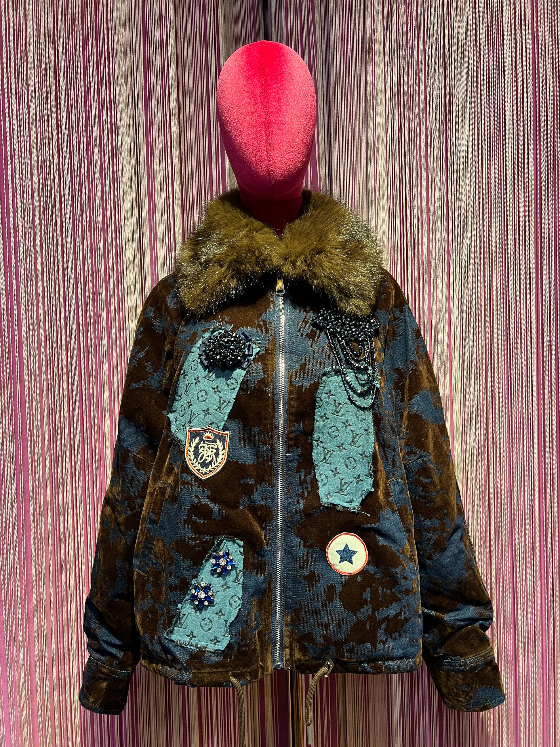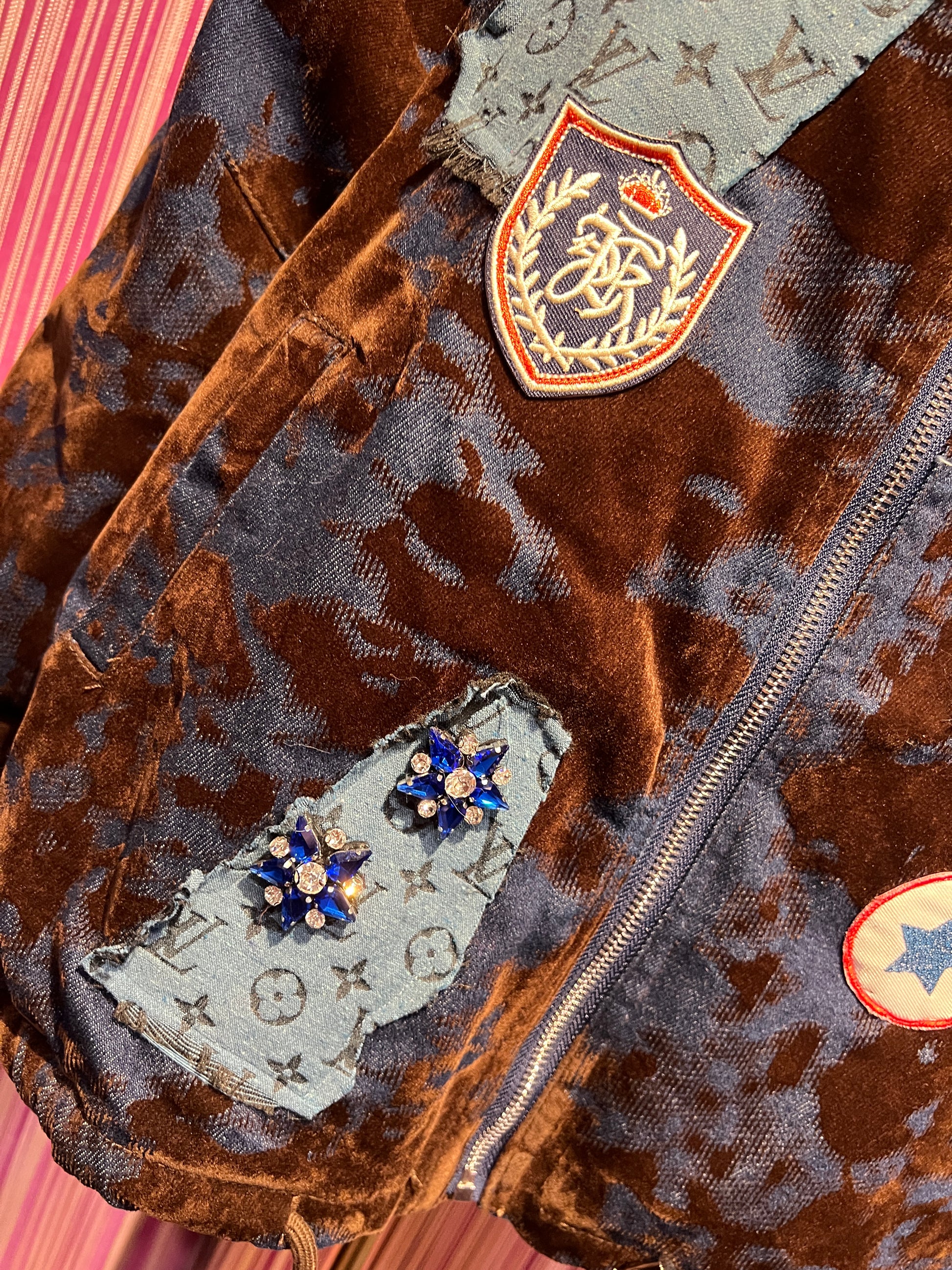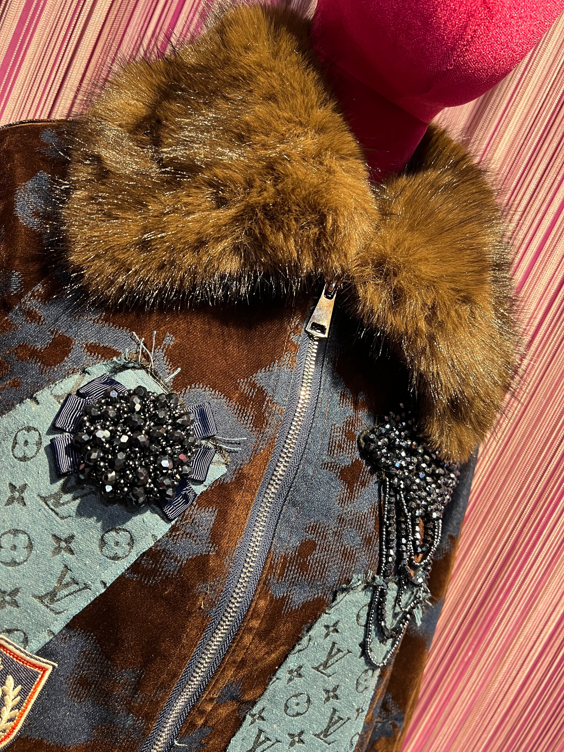 ABpink 🩷vellutina . Giubbino velluto con interno in ecopelliccia, colletto rimovibile , applicazioni patch cristalli blu e tessuto LV