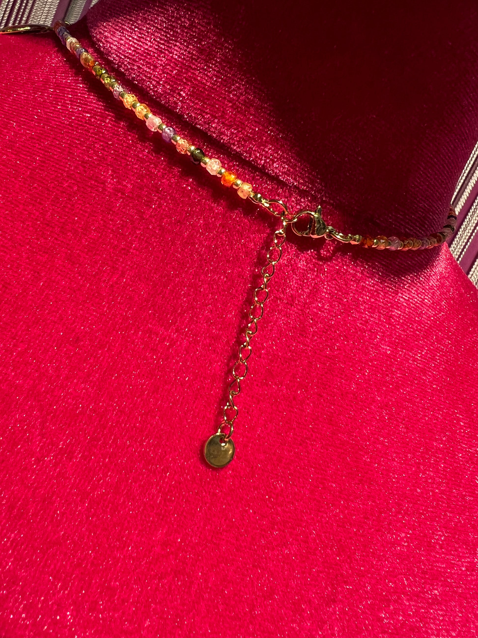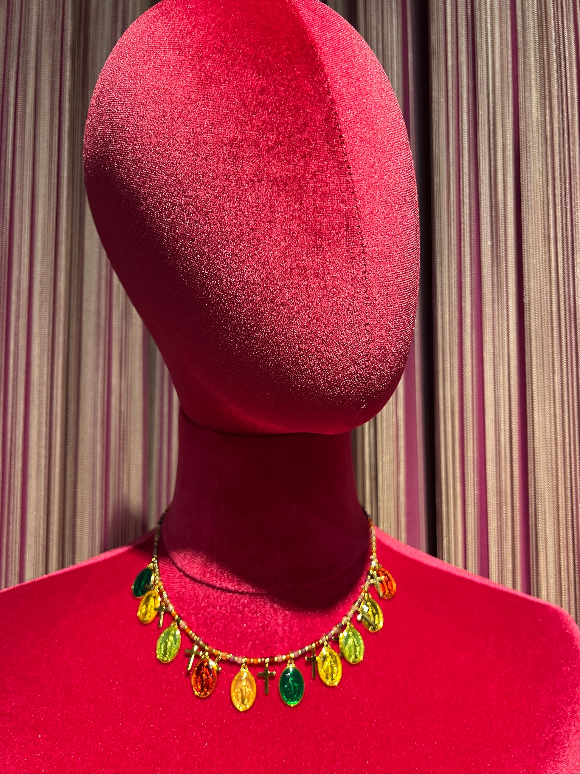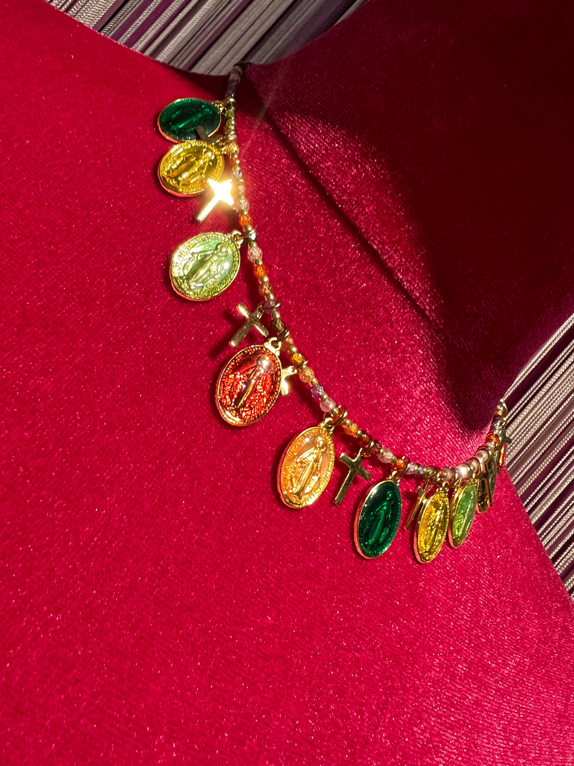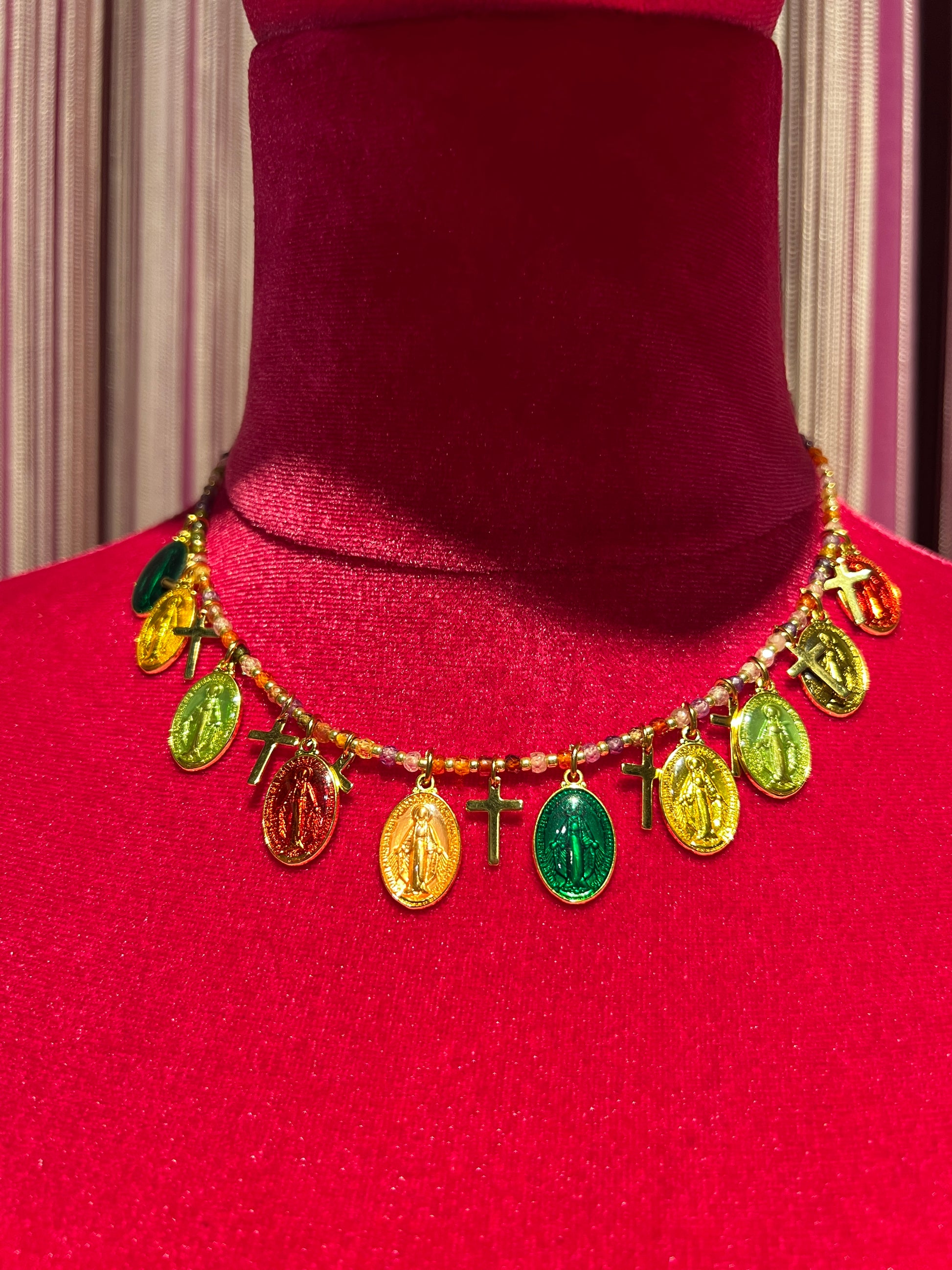 Manuela Ajo creazioni collana immagini sacre multicolori e croci oro montate su filo perline vetro