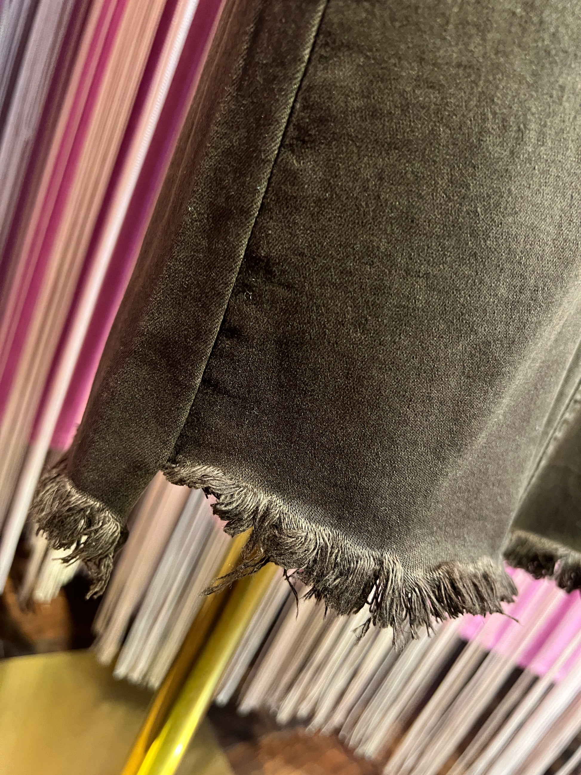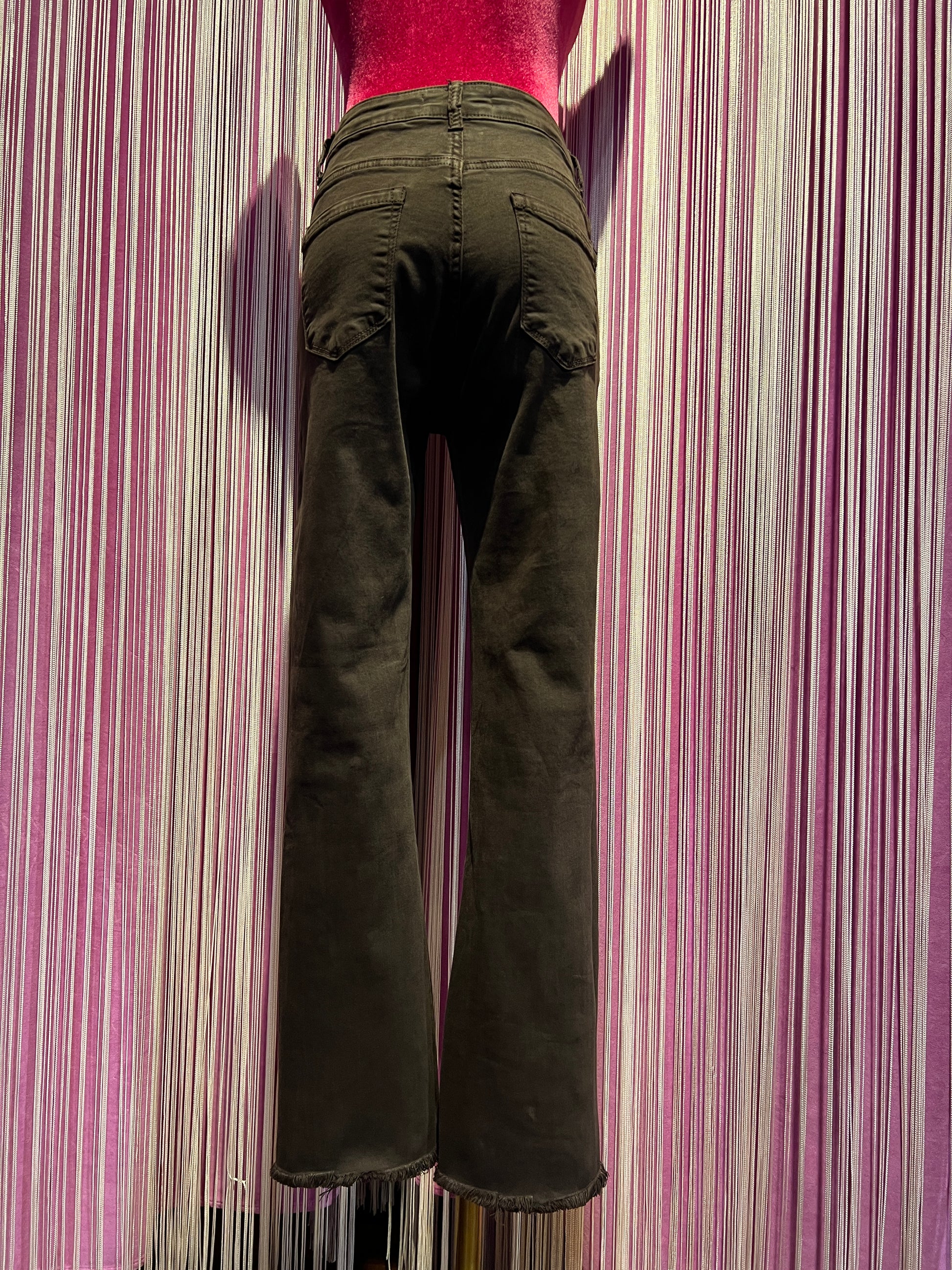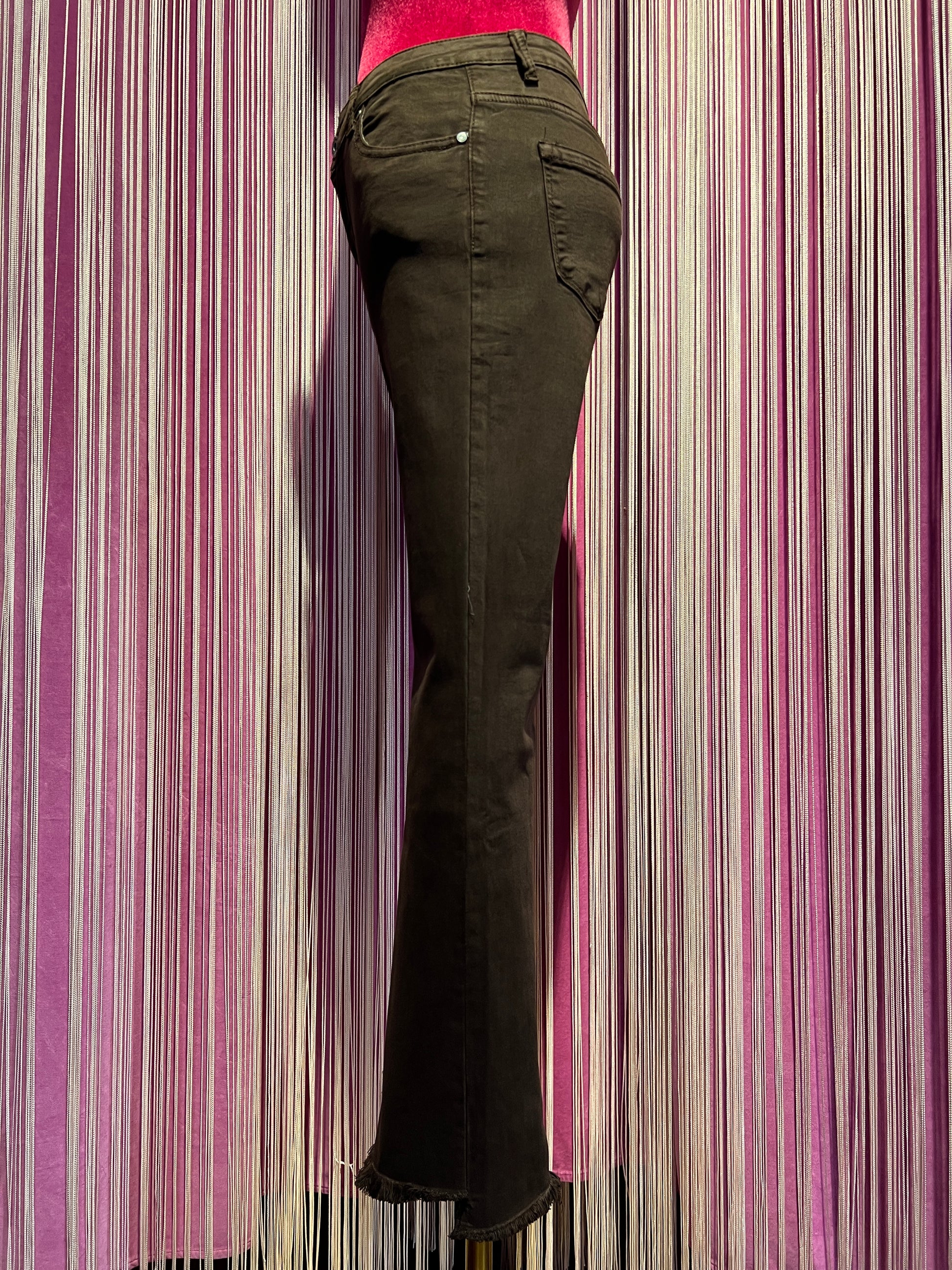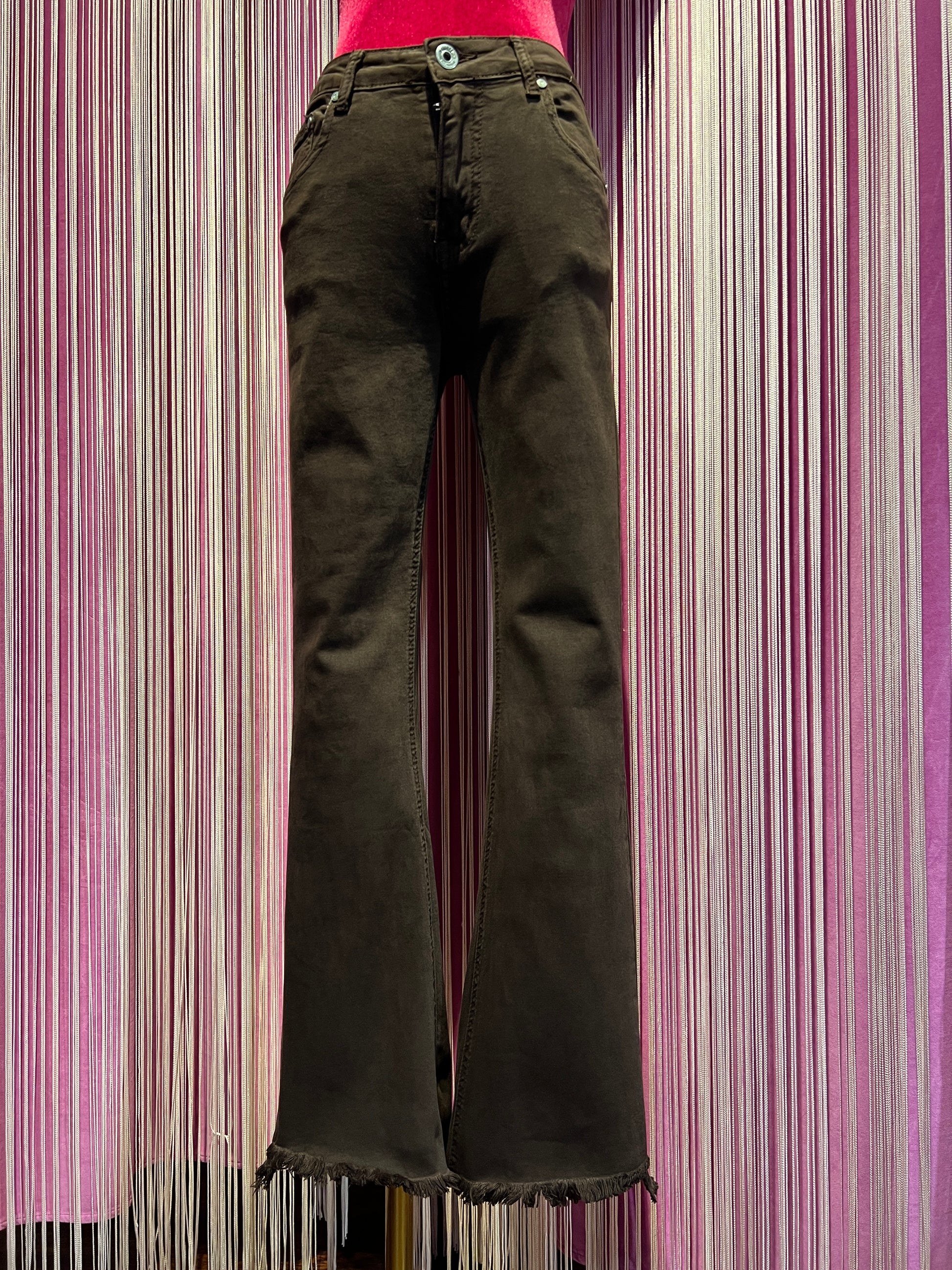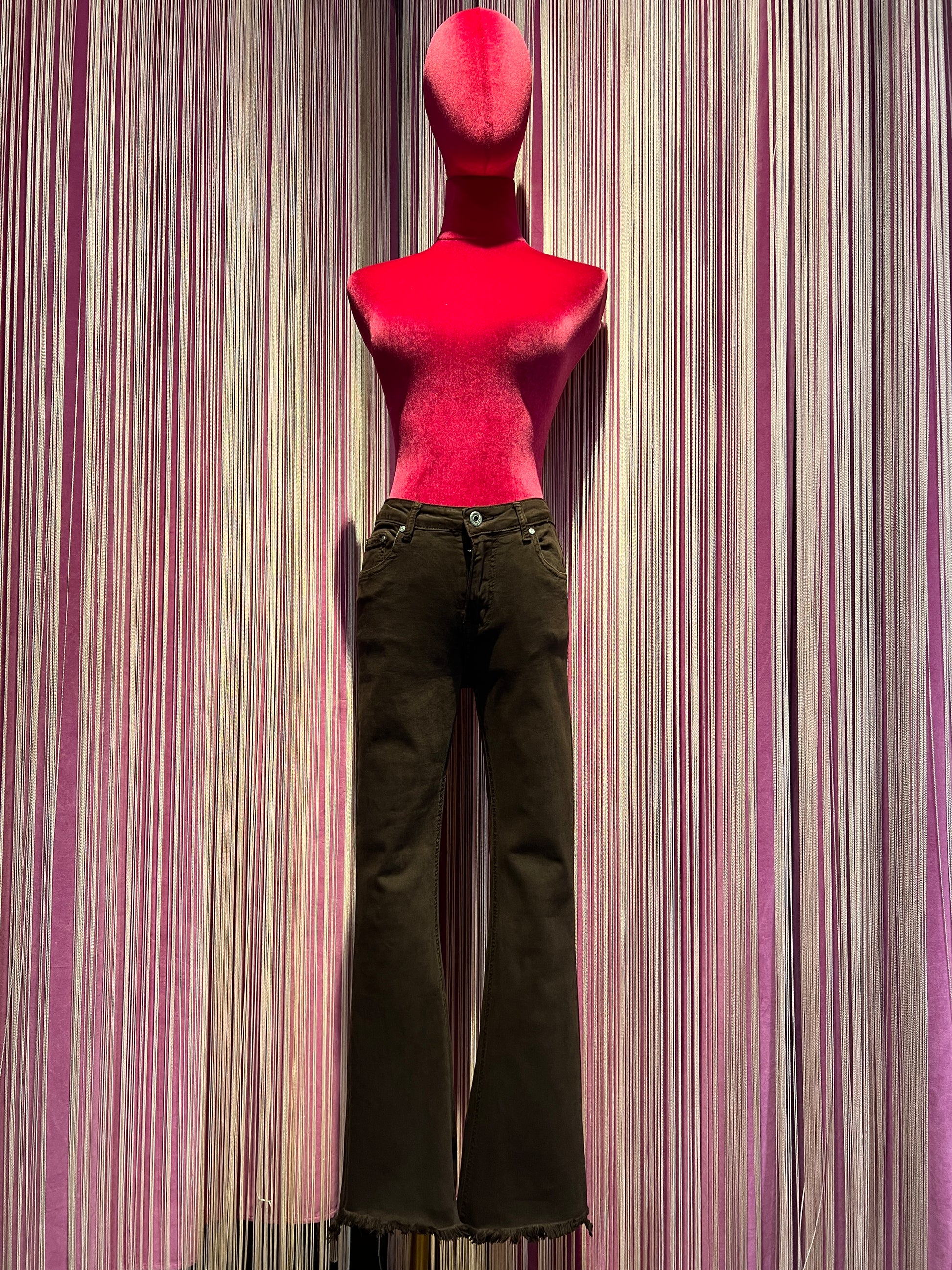 Mon amour Paris pantalone 5 tasche elasticizzato a zampetta , orlo sfrangiato cioccolato