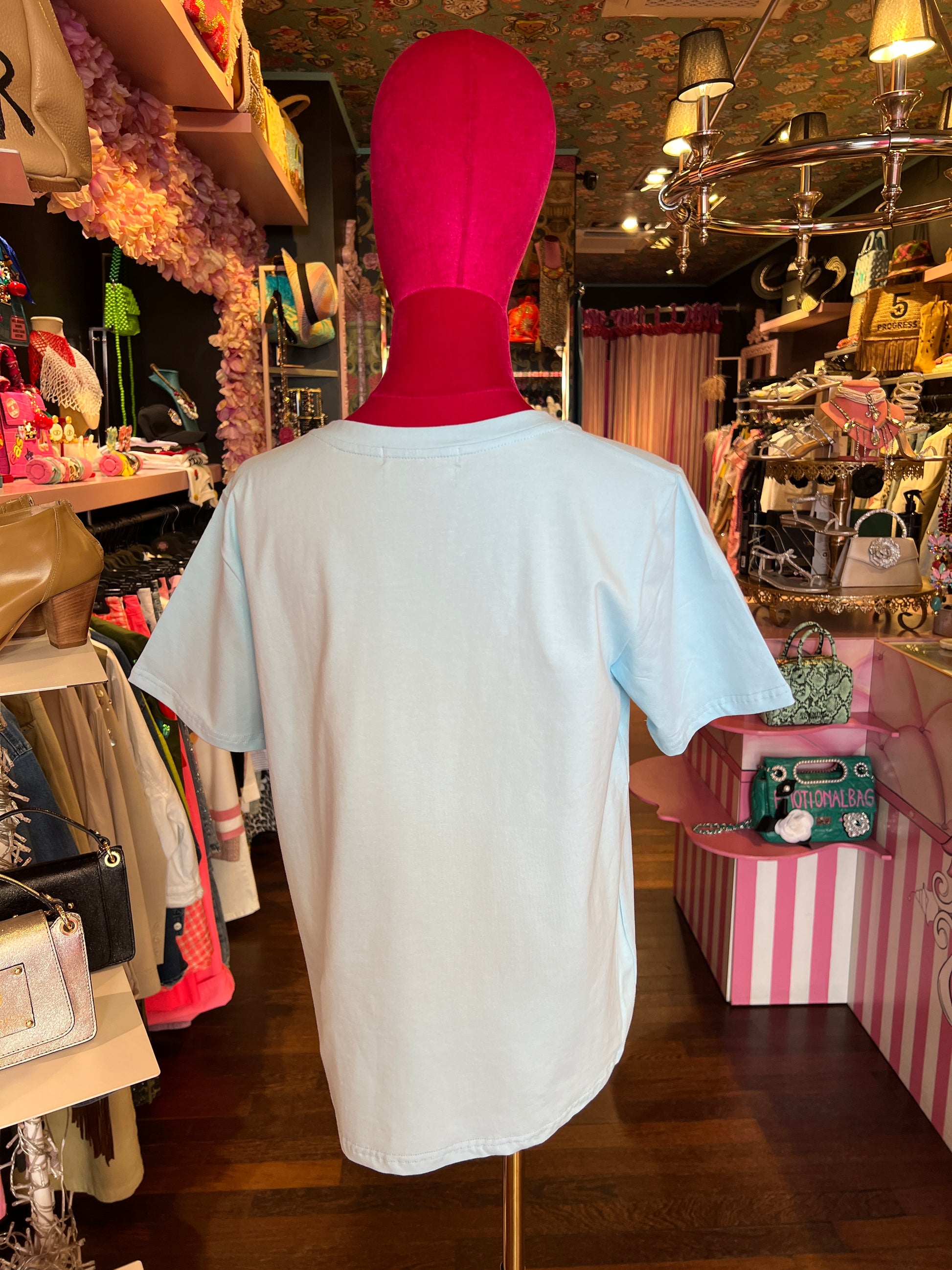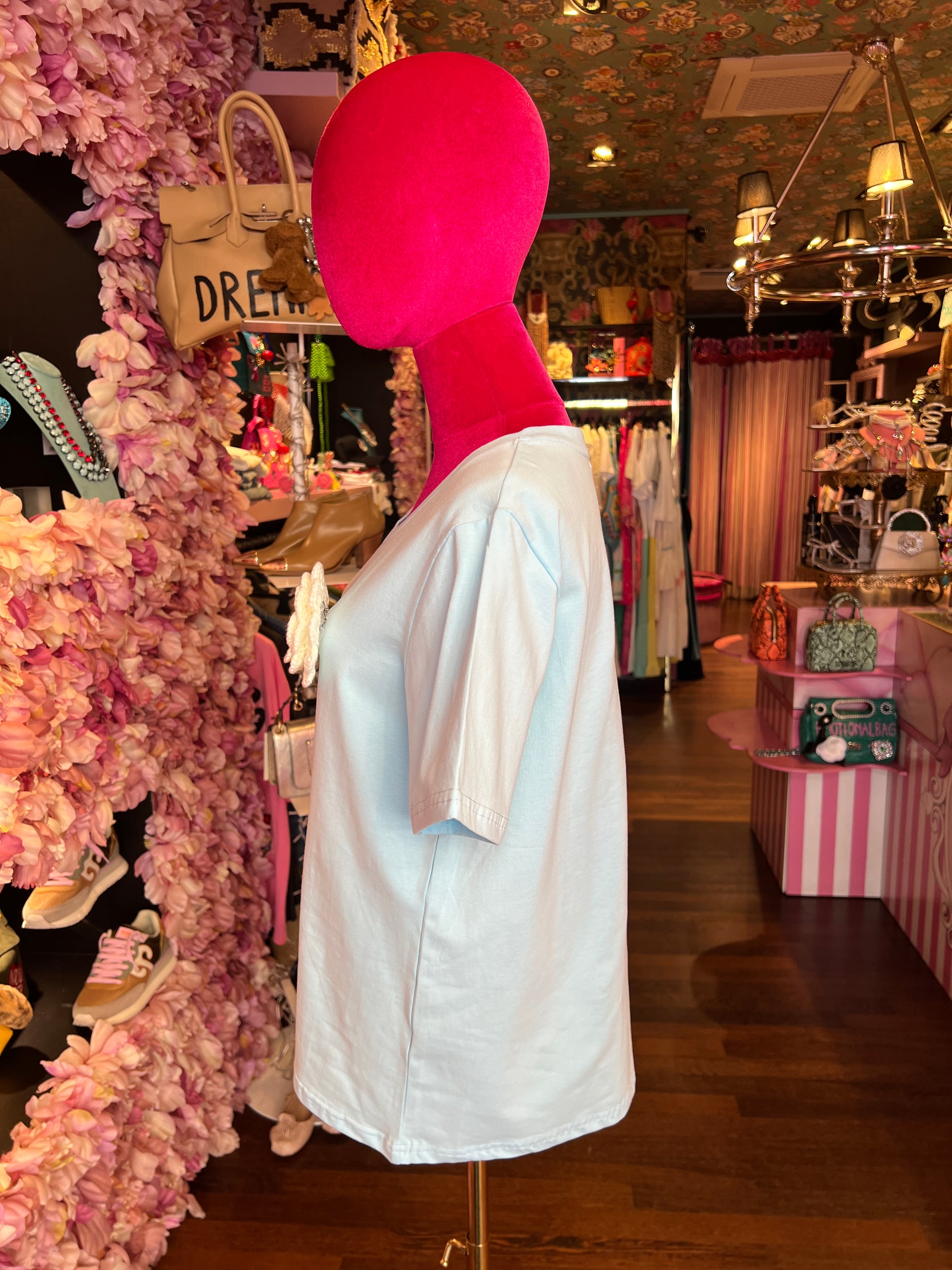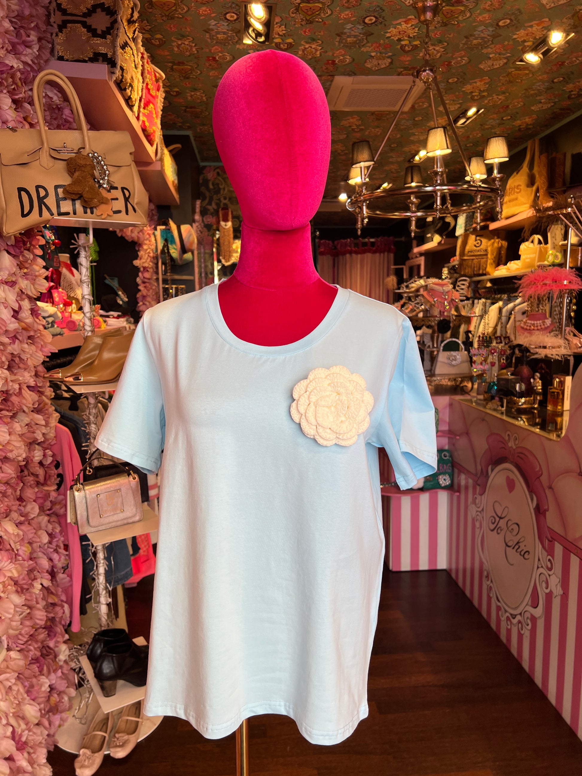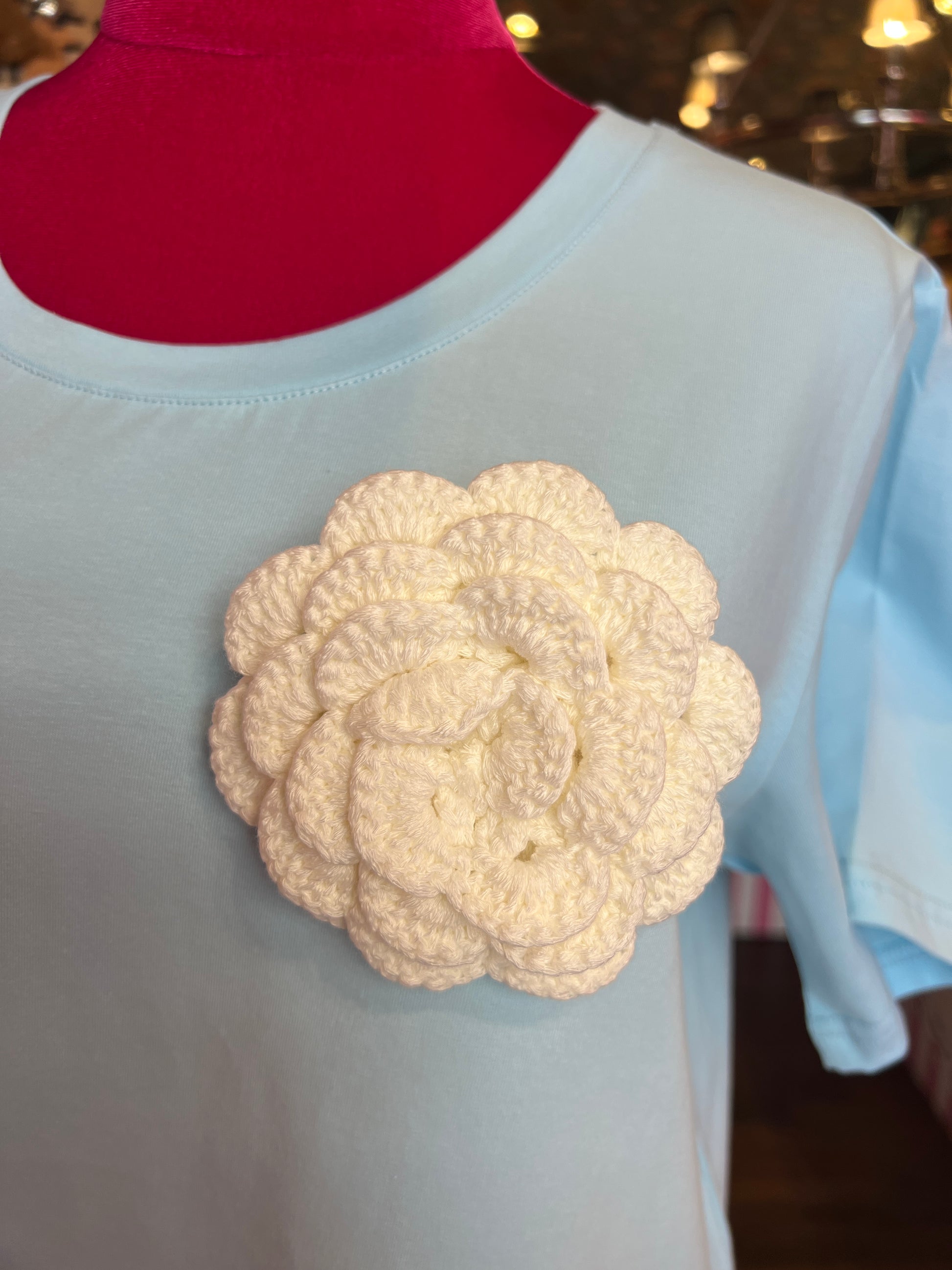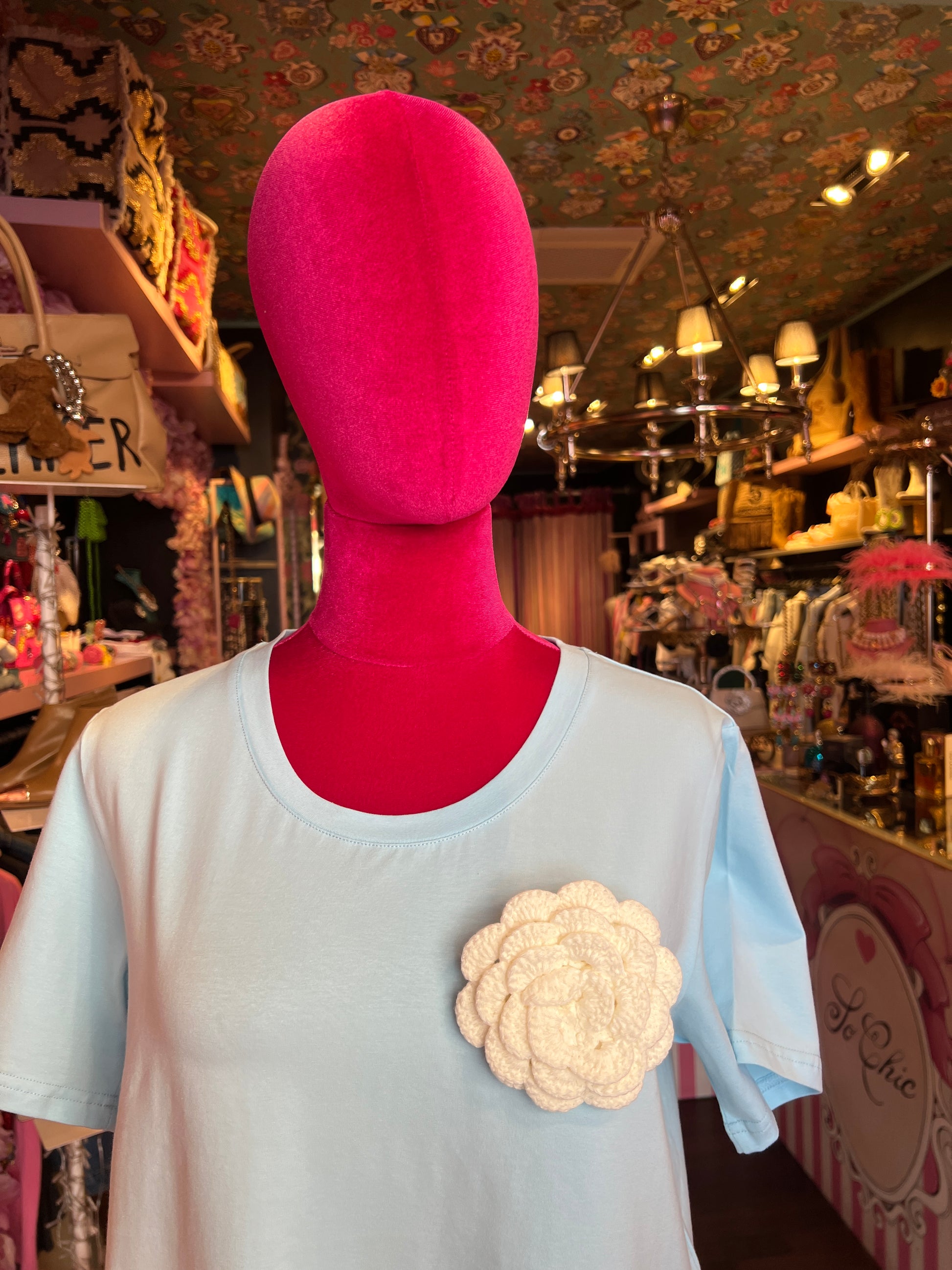 Mon amour Paris -20% di sconto t shirt cotone celeste con spilla camelia bianca uncinetto