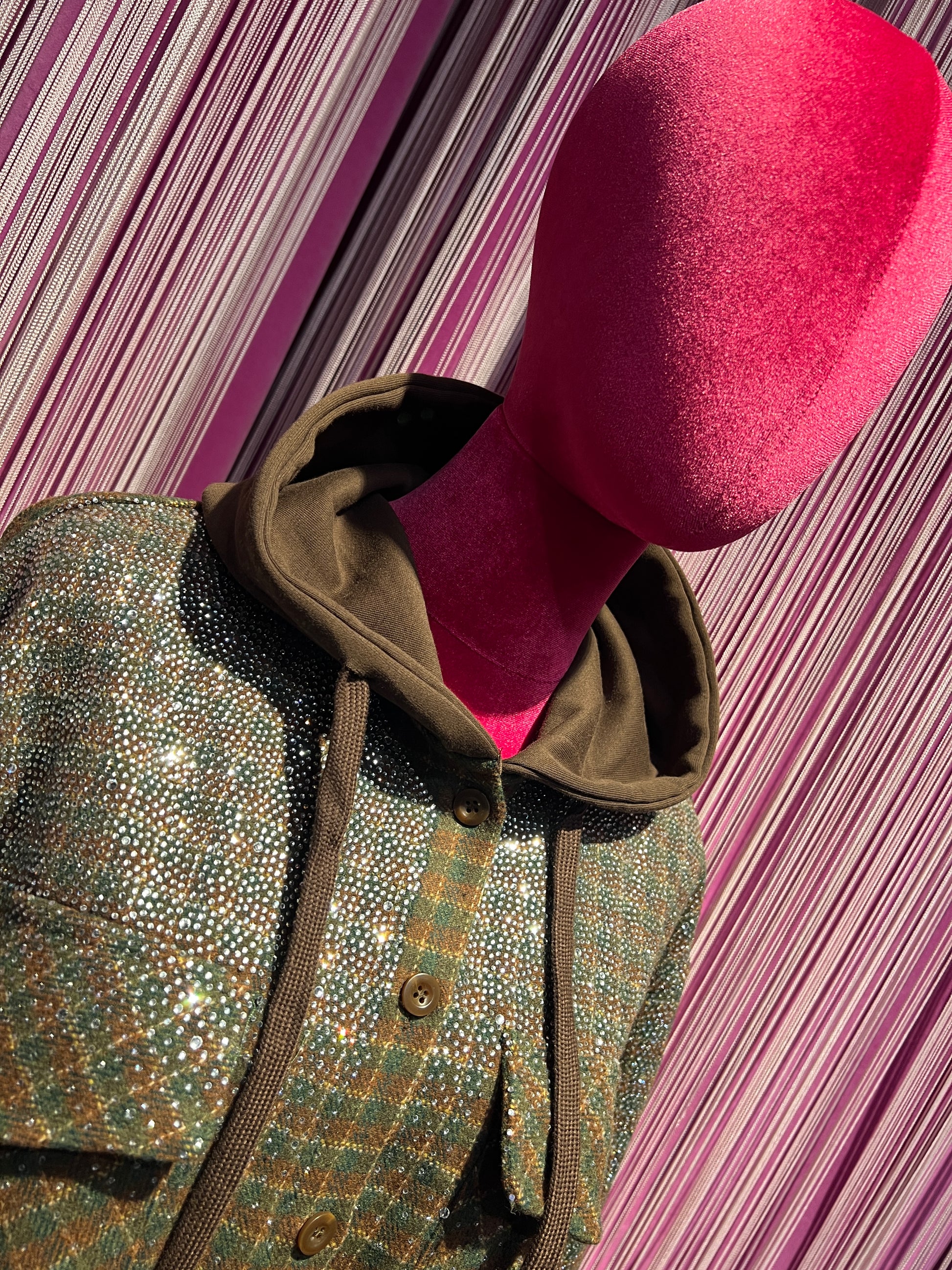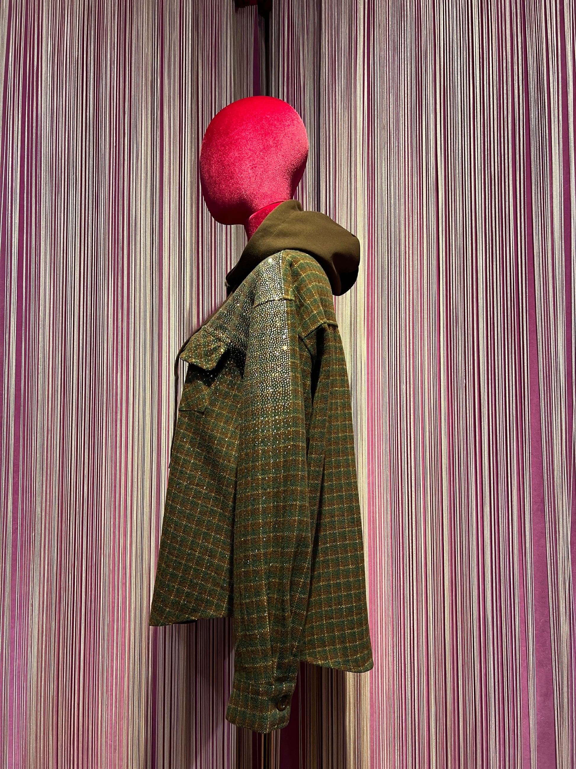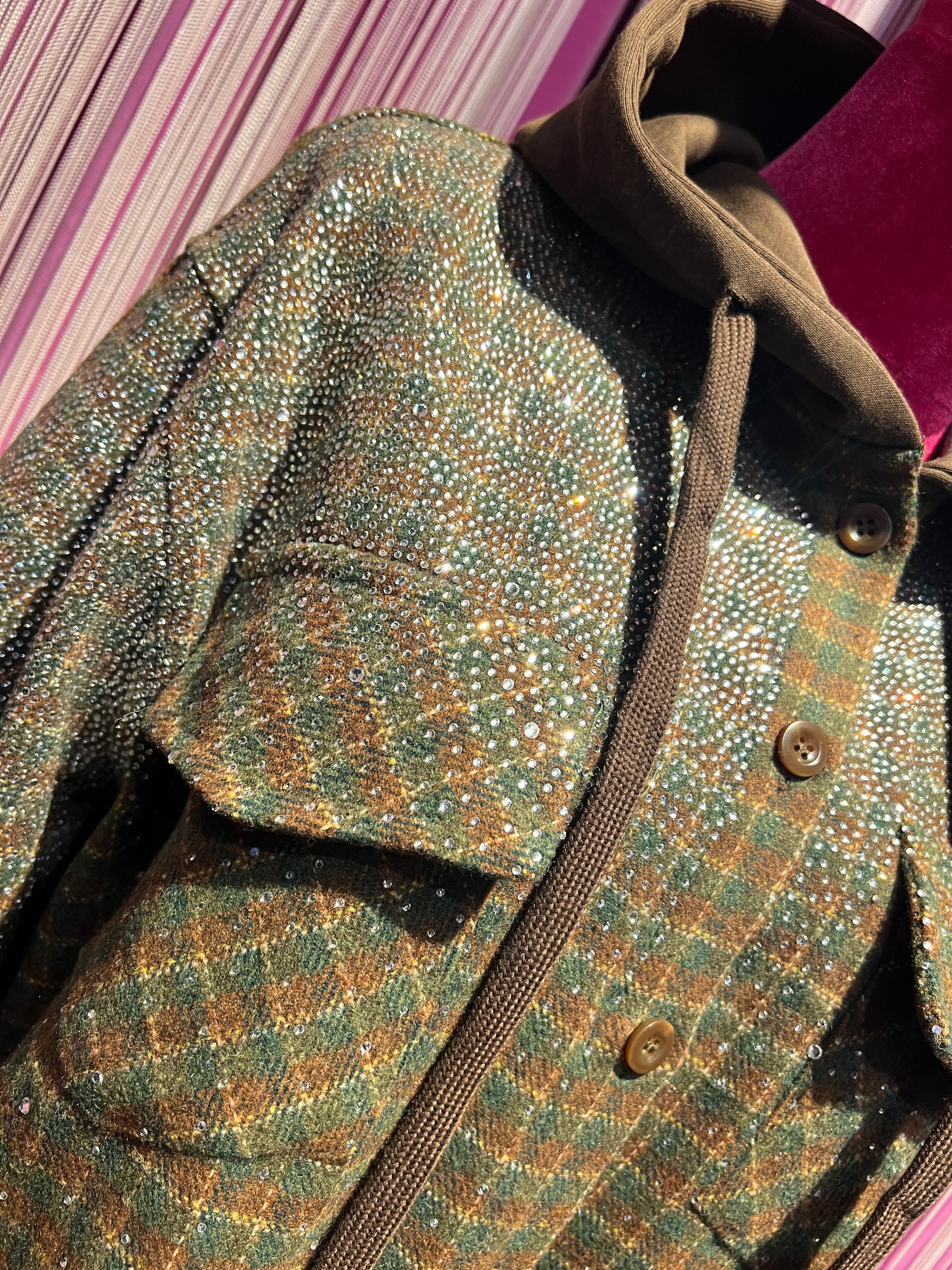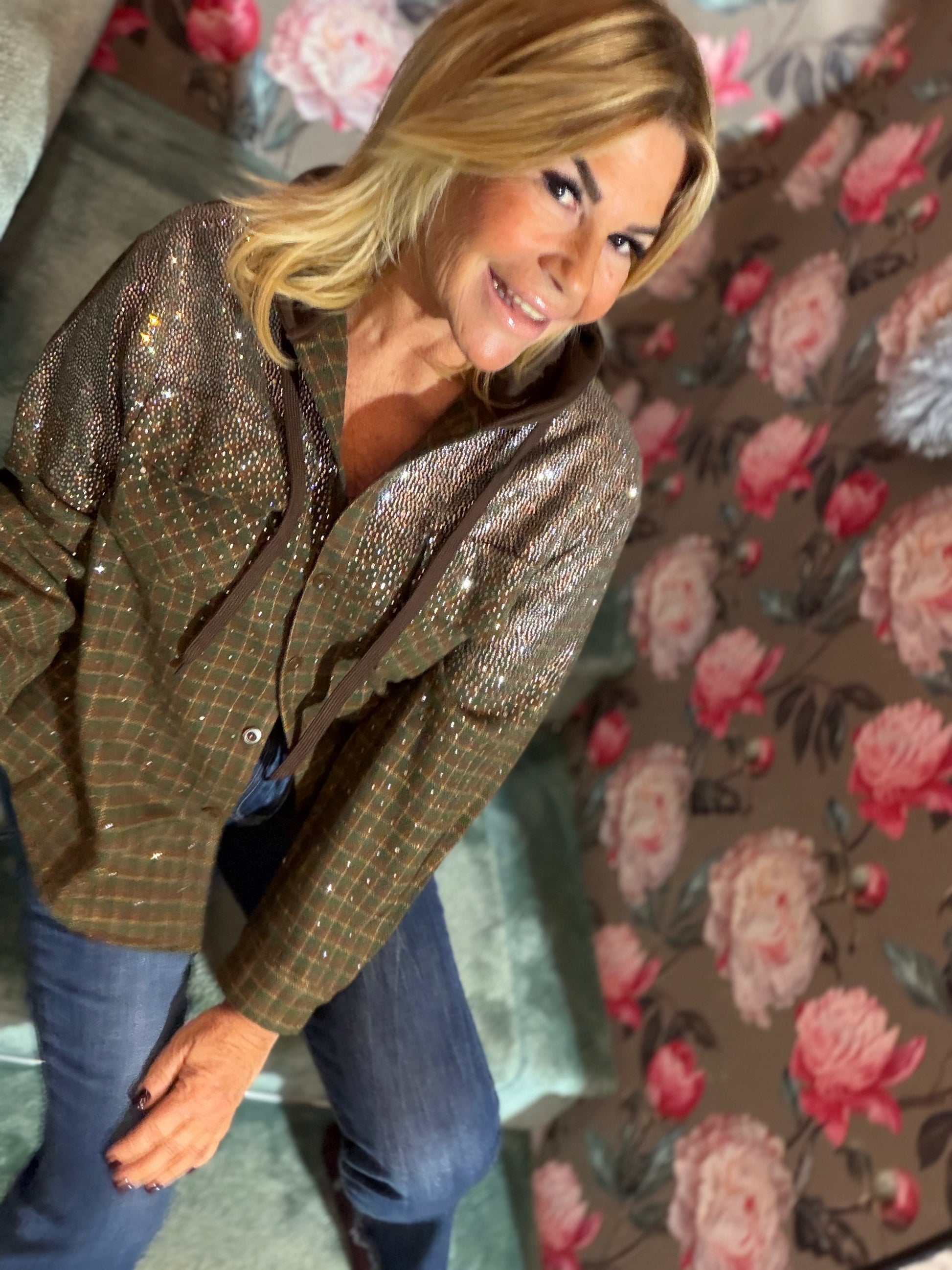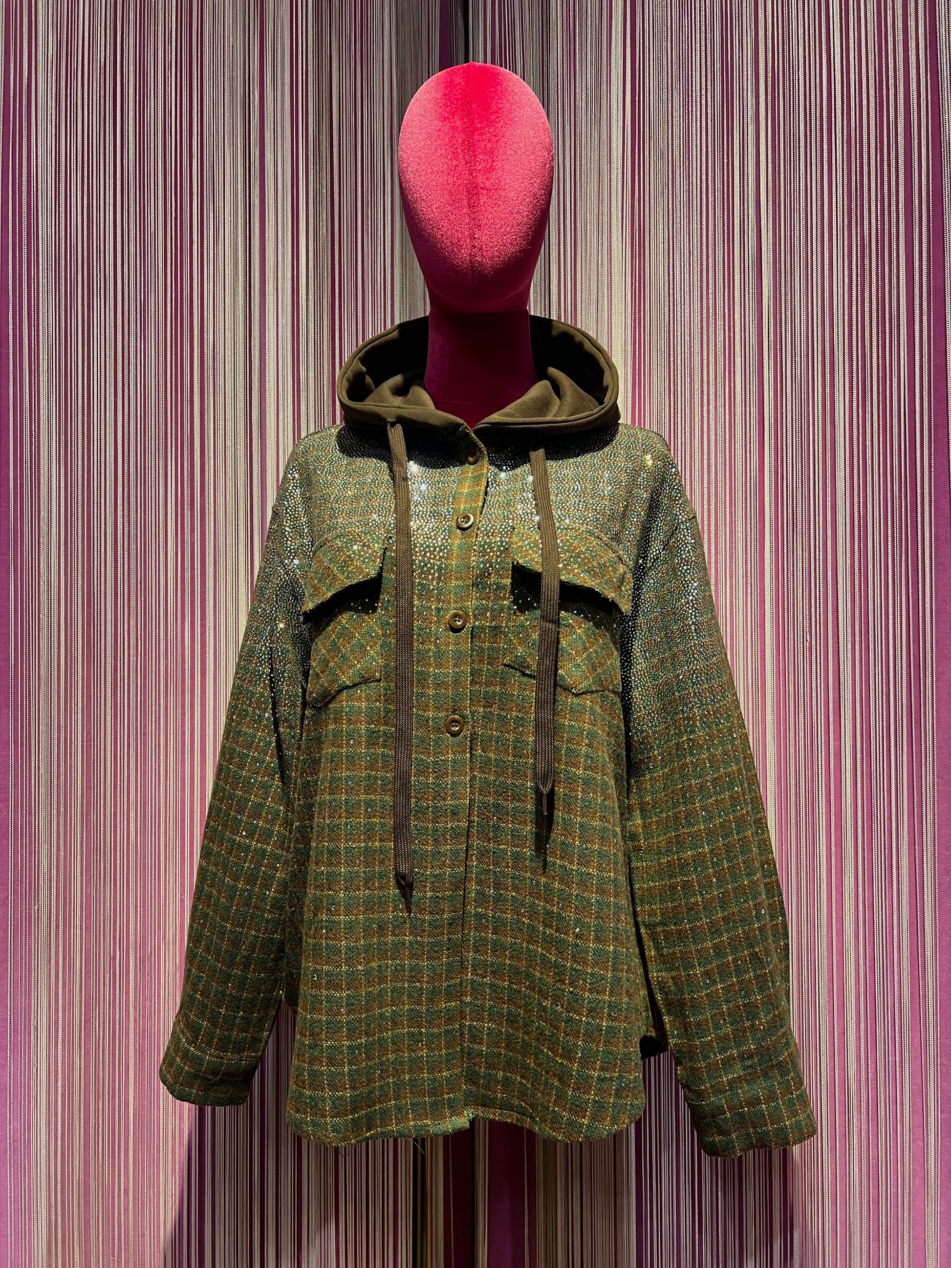 The room camicia giubbotto con cappuccio ,fantasia quadri e cristalli